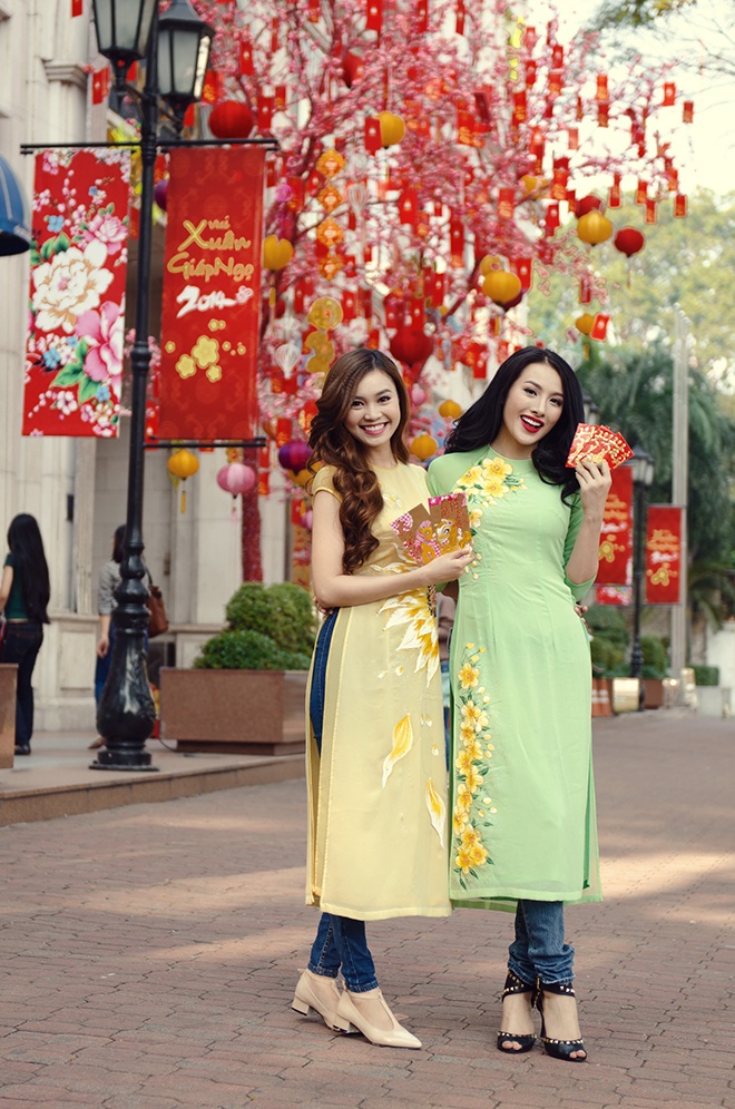| Ninh Dương Lan Ngọc và Trương Nhi tươi tắn trong áo dài cách tân với họa tiết hoa được vẻ bằng tay đẹp mắt. |