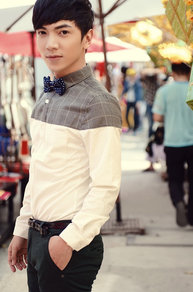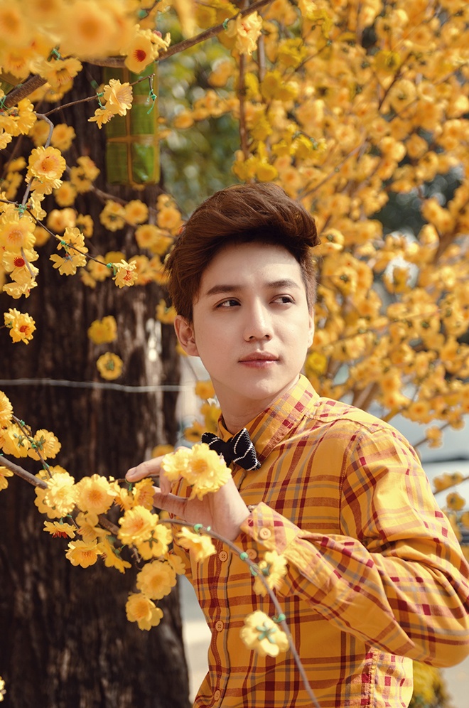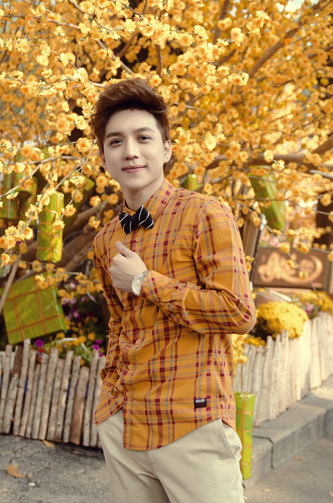 | Hot boy "dao kéo" Vĩnh Cường trẻ trung với áo caro sắc vàng hoa mai. |