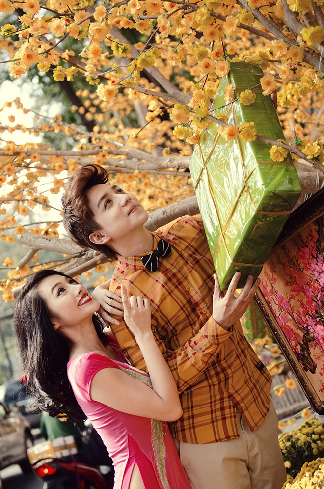 | Trương Nhi và Vĩnh Cường rạng rỡ với bánh chưng xanh trên con phố Hoa Mai, đường Phạm Ngọc Thạch, Q.1, TP.HCM. |