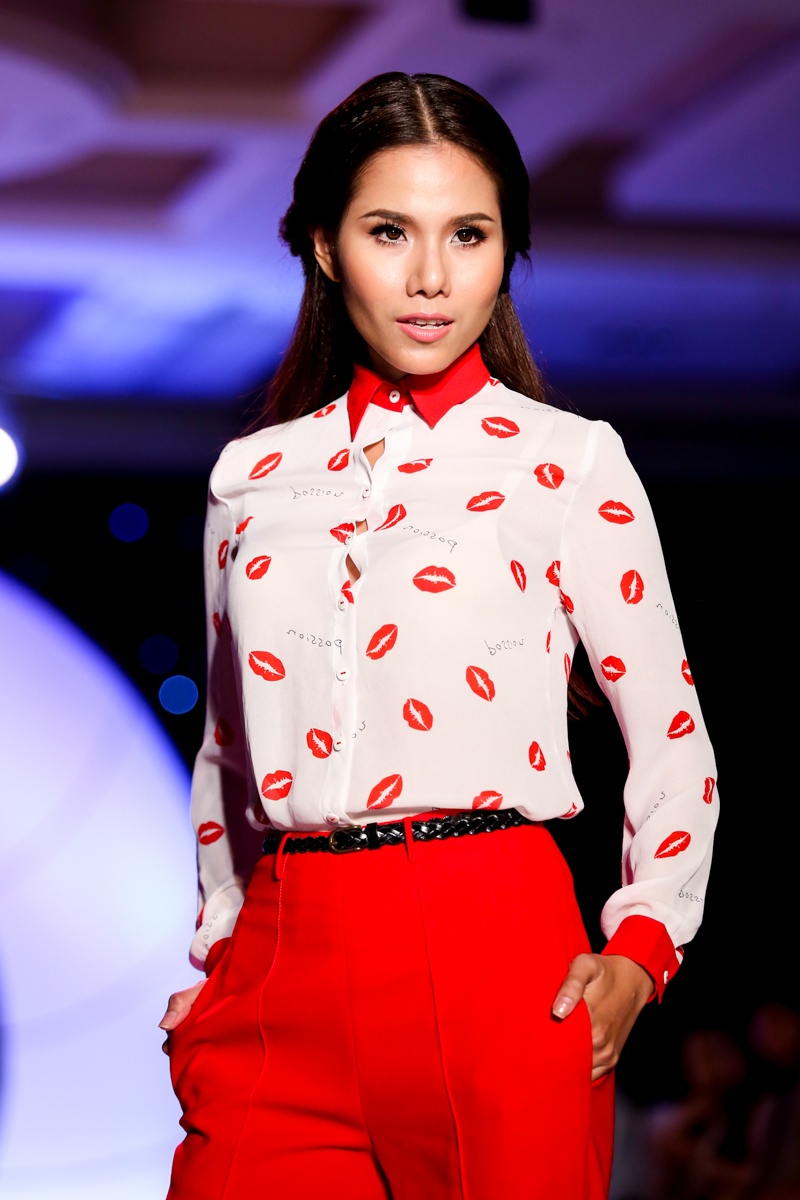 | Họa tiết môi trên áo sơ mi kết hợp nổi bật cùng quần gam màu đỏ. |