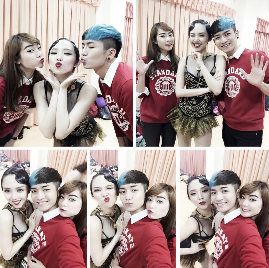 | Trần Bảo Bảo và Kim Nhã chụp ảnh cùng ca sĩ Tóc Tiên trong hậu trường The Remix. (Ảnh nhân vật cung cấp). |