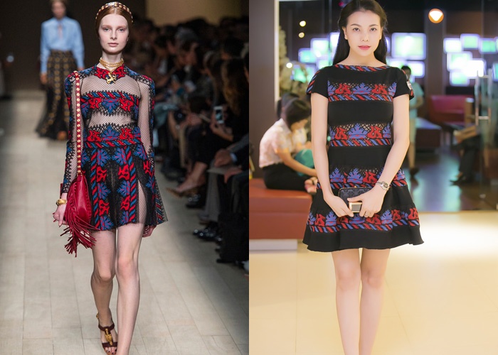 Trong khi Trà Ngọc Hằng diện cây đồ hiệu mới nhất của Valentino thì nữ diễn viên "Cuộc chiến hoa hồng" lại nổi bật trong chiếc đầm thanh lịch, sang trọng của Elise.