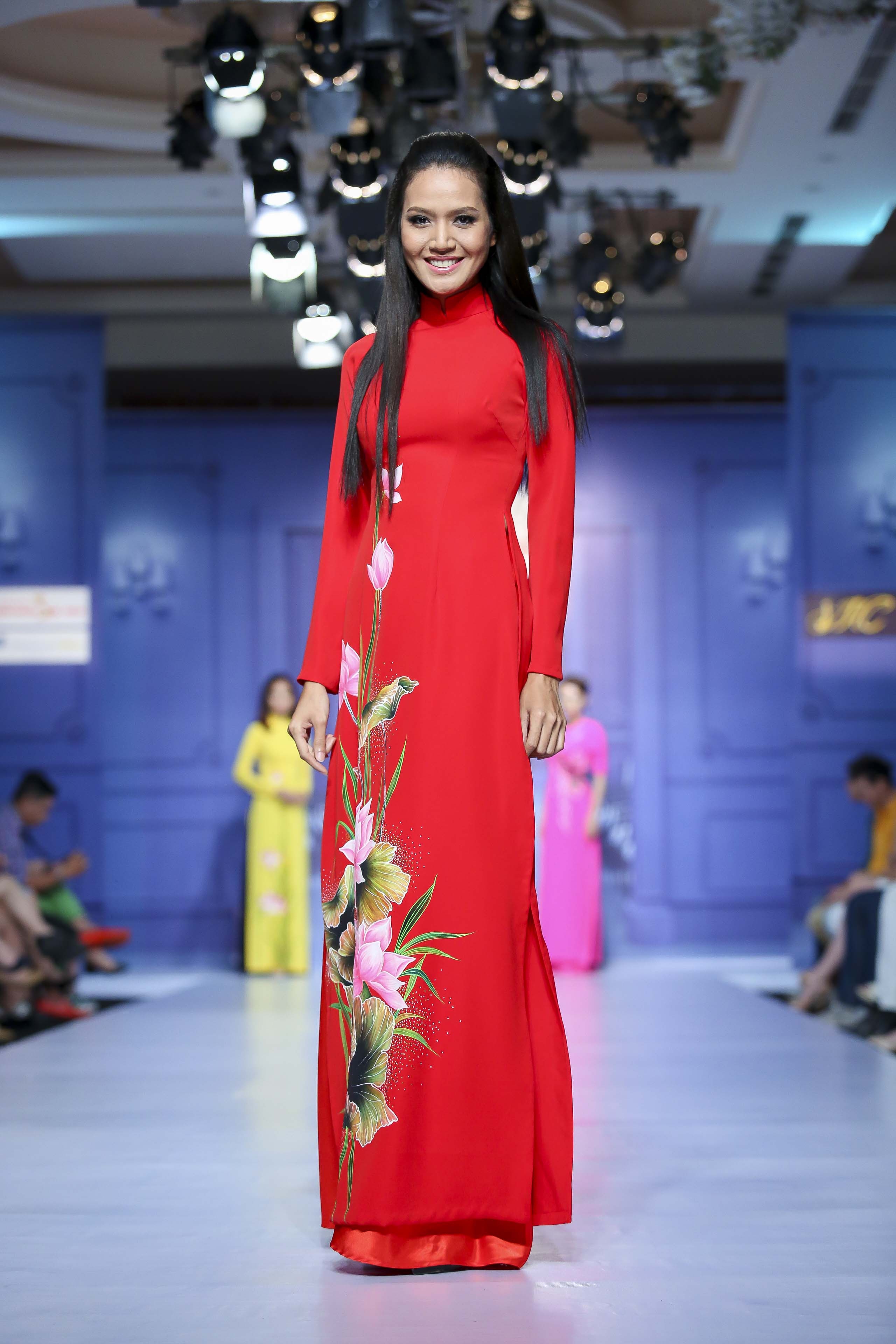 | Người mẫu Quanh Đi mở màn show thời trang với áo dài tông đỏ, hoạ tiết hoa sen in nổi bật trên tà áo. |