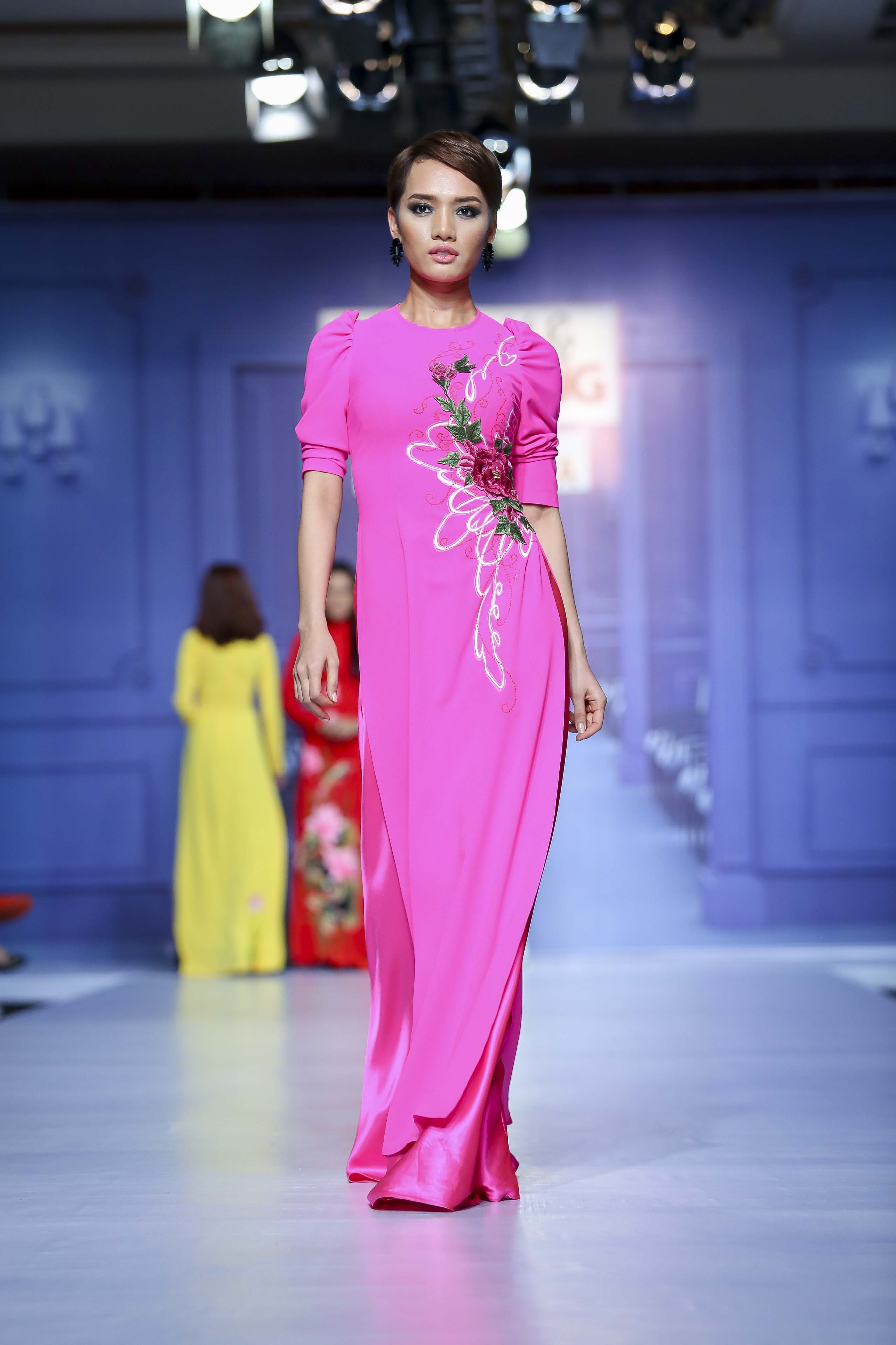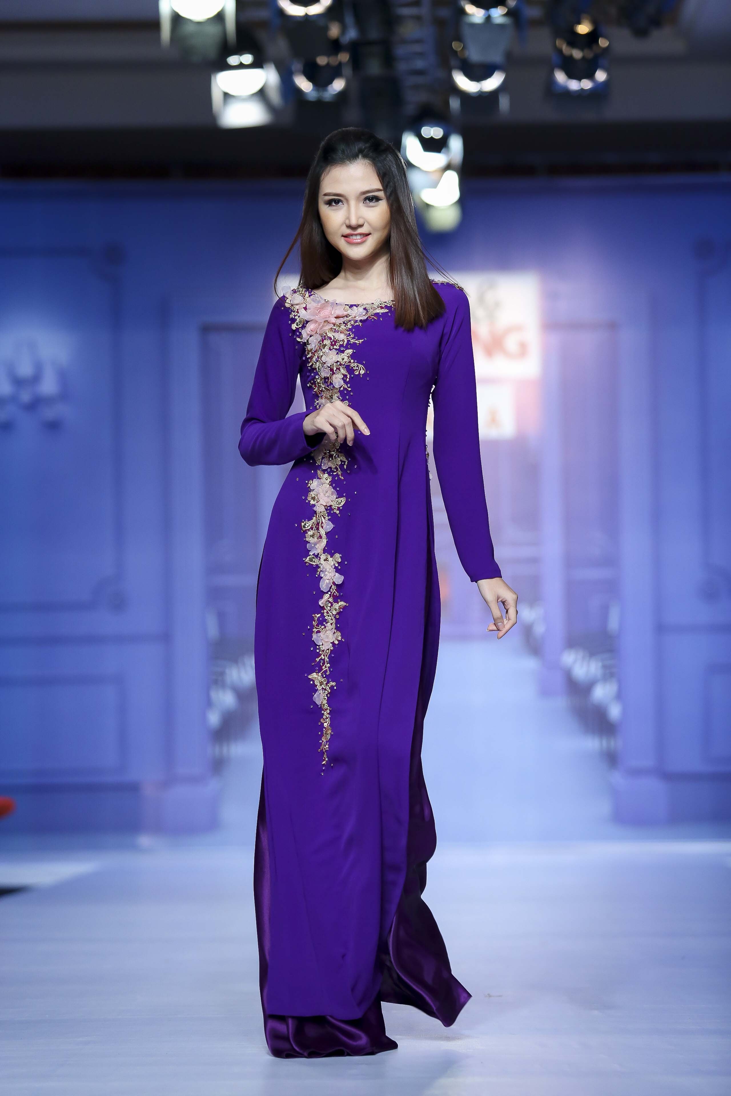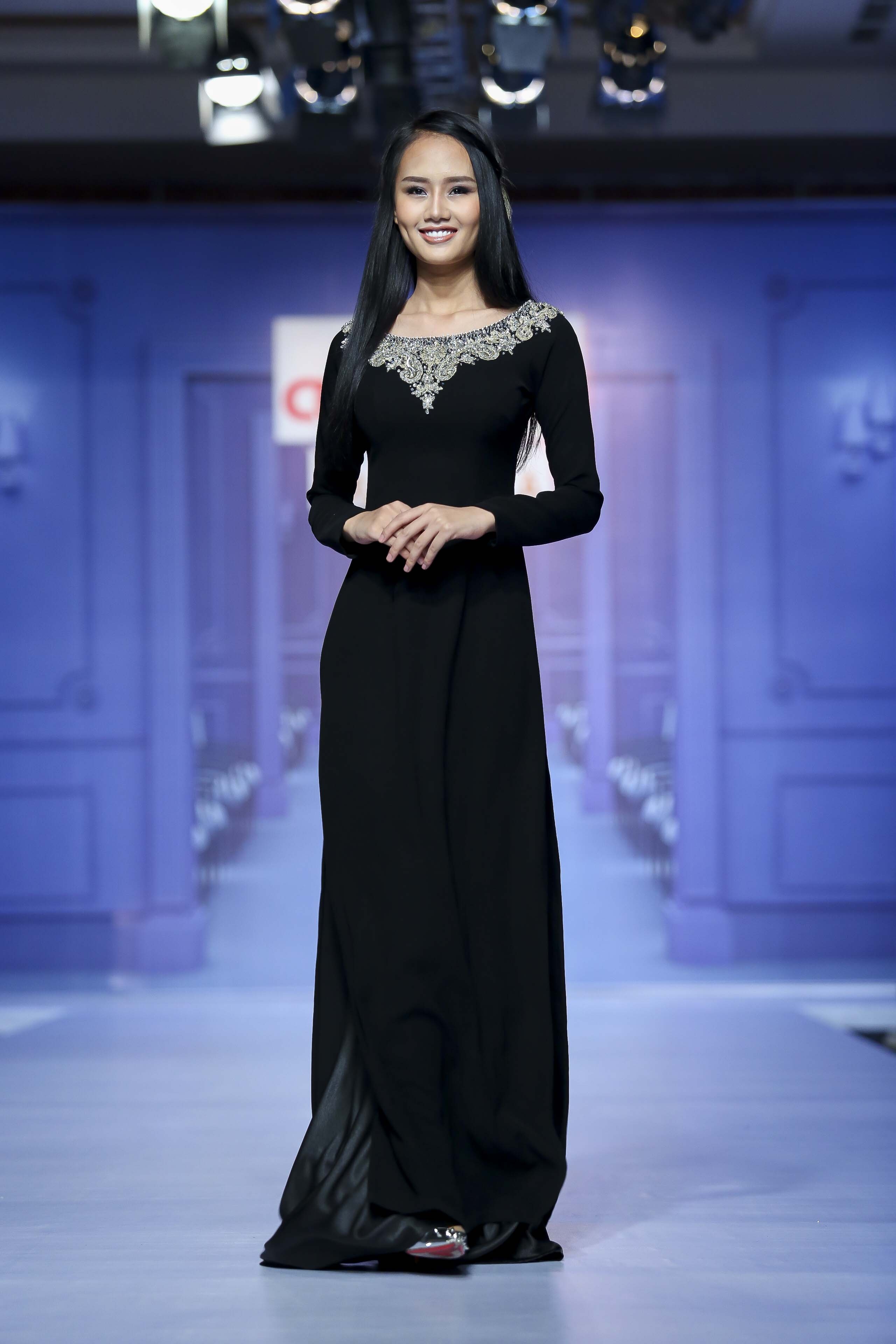 | Ngoài áo dài nhiều màu sắc, dàn mẫu Sài thành còn trình diễn một số thiết kế tông đen tuyền, chất liệu nhung. |