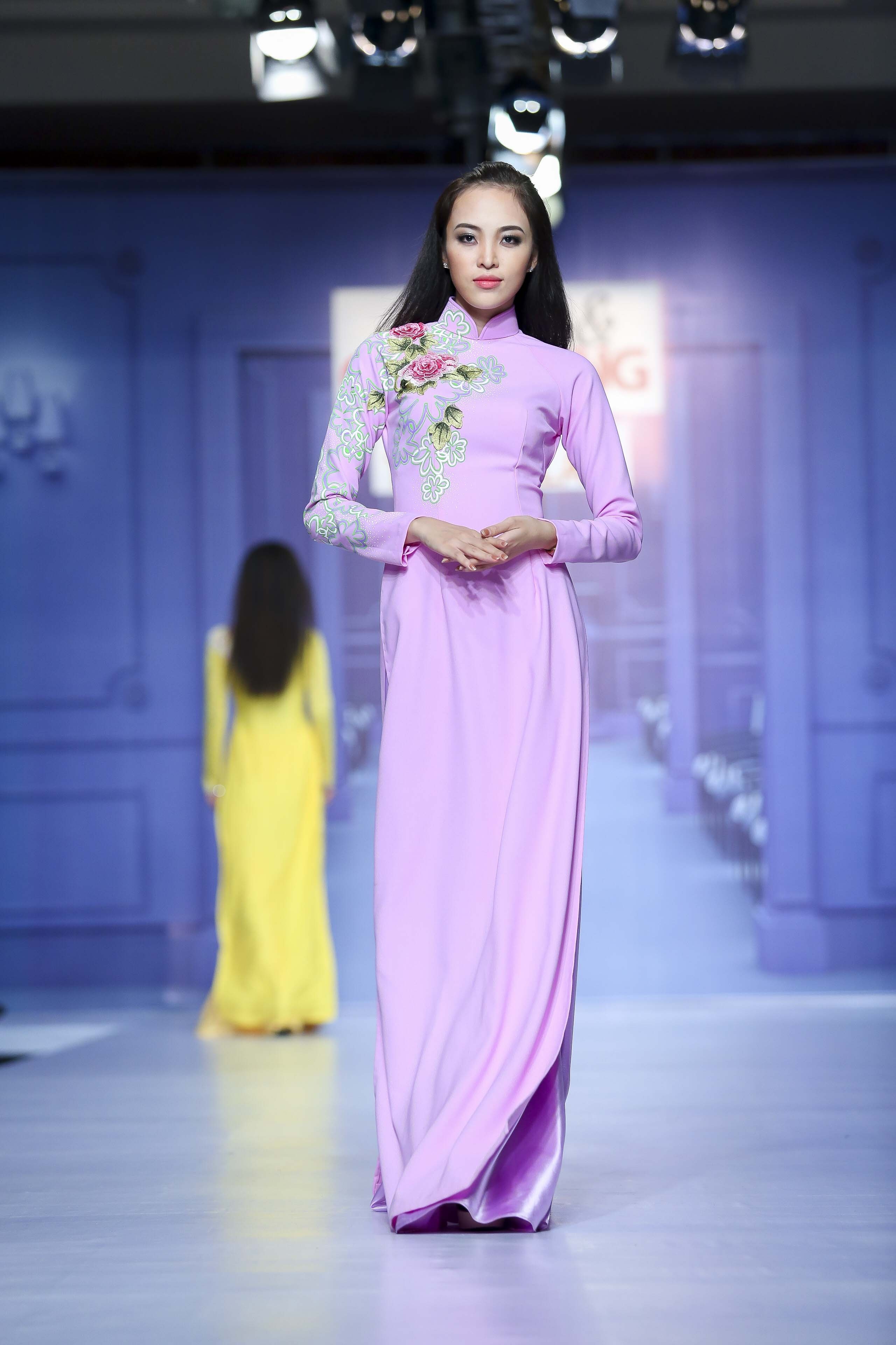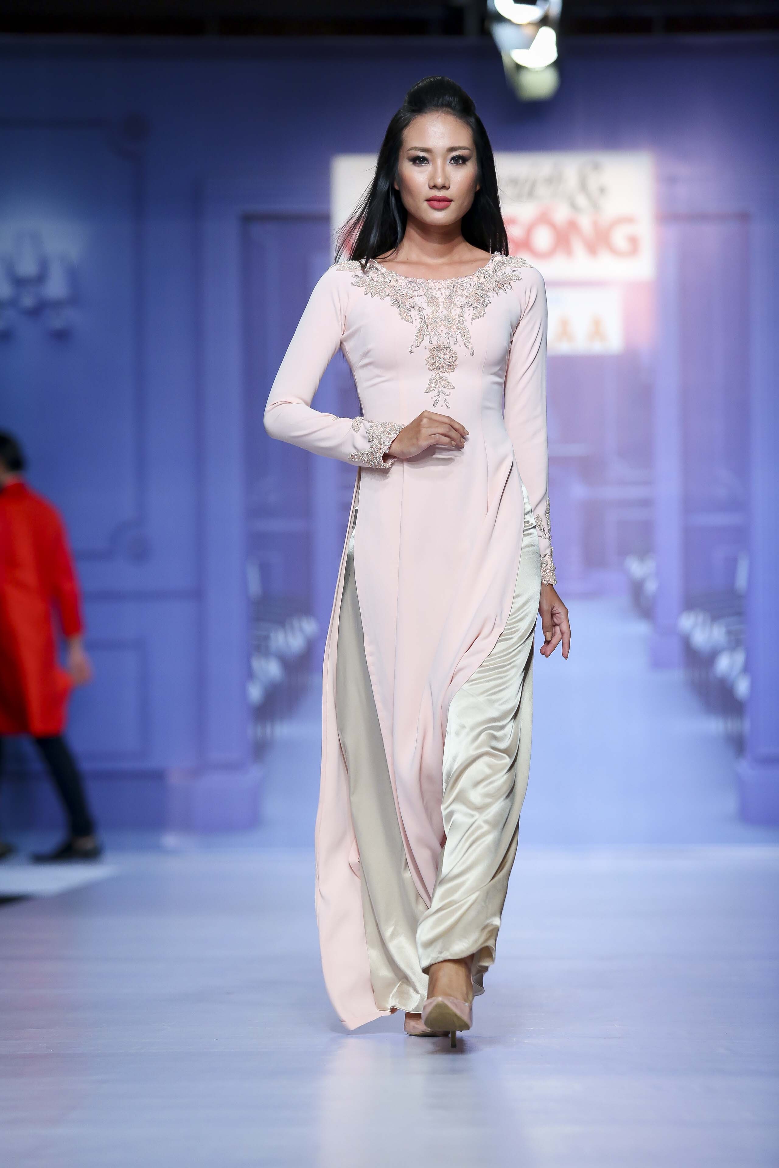 | Người mẫu Nhã Trúc nhẹ nhàng catwalk với áo dài hồng pastel nhã nhặn. |