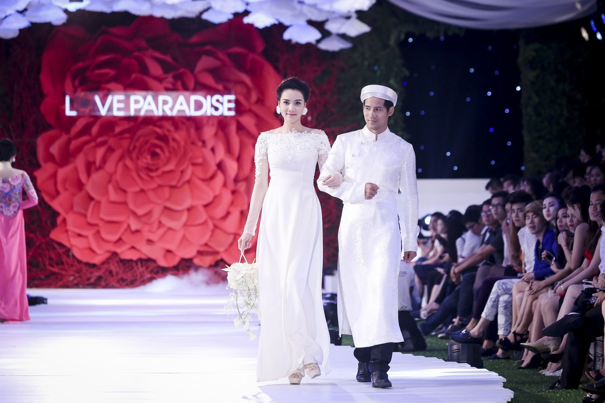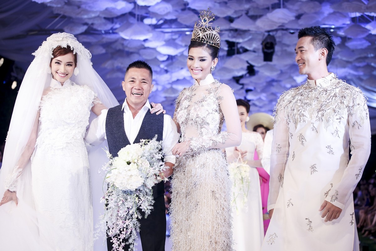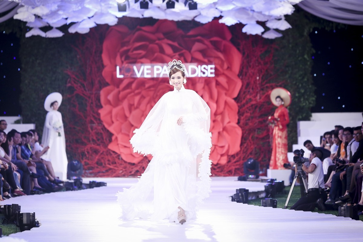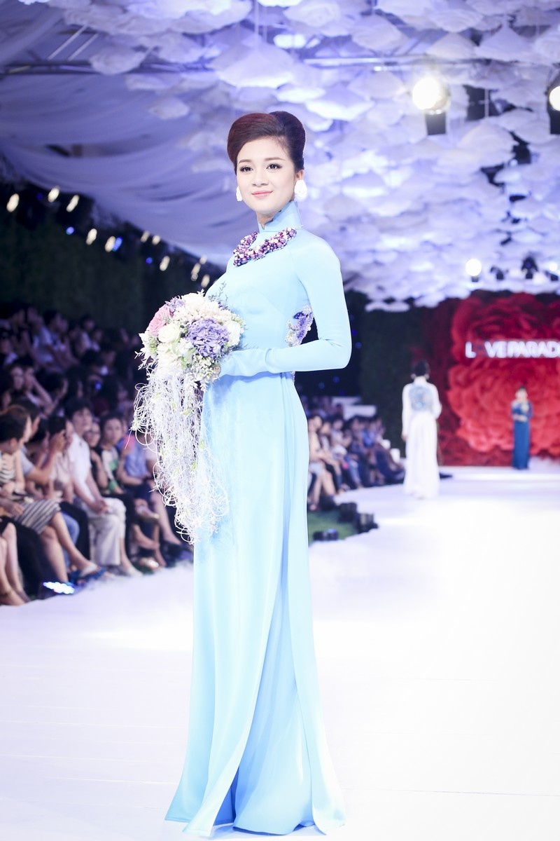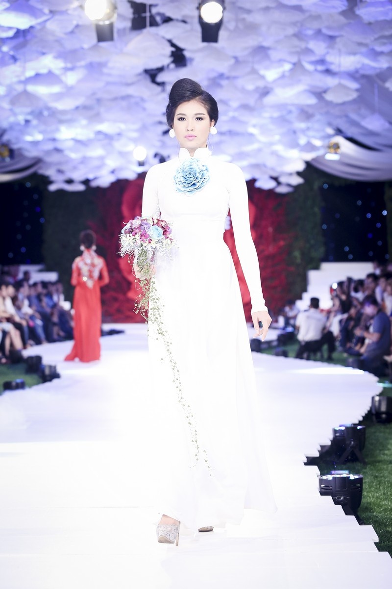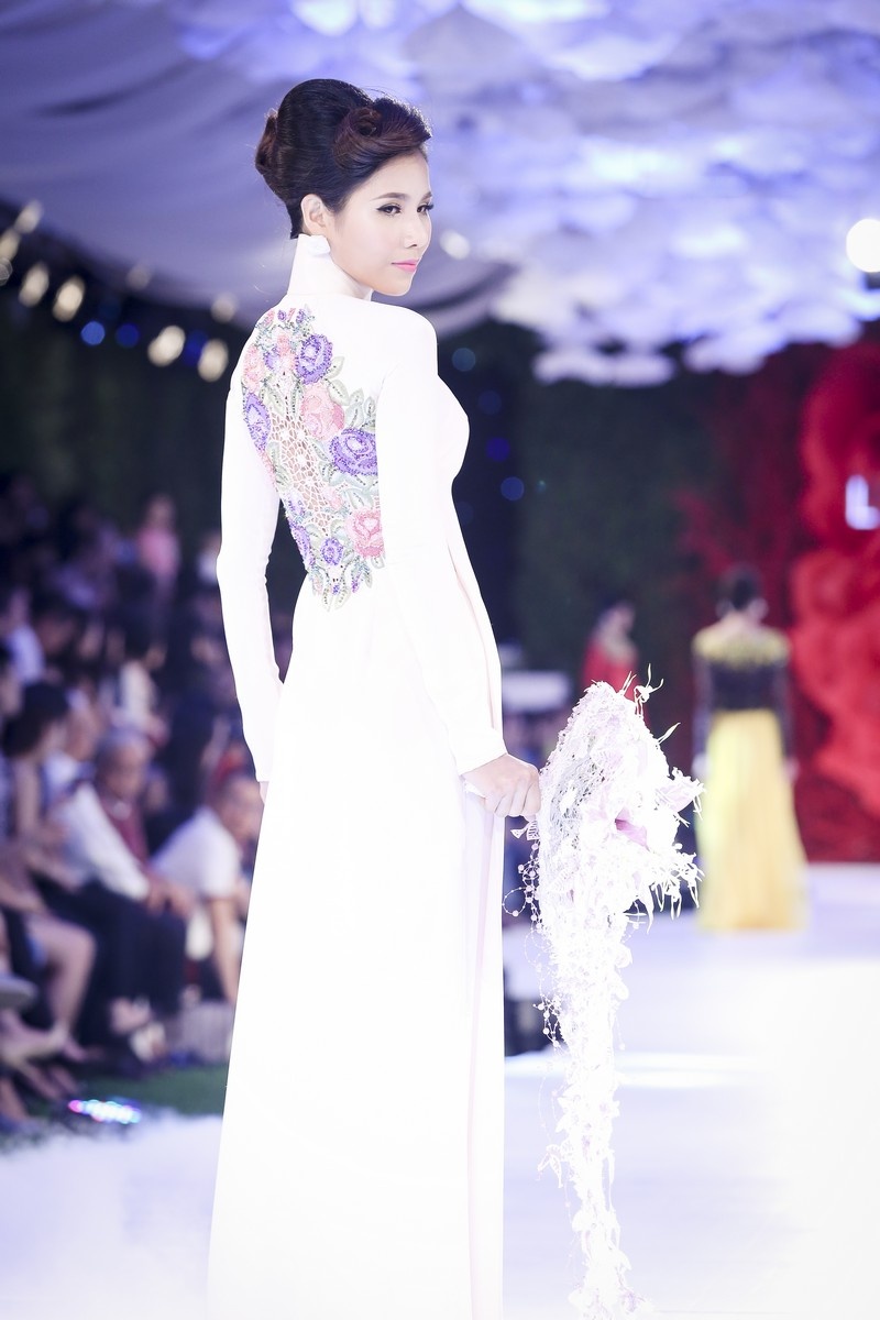 | Tối 20/4, NTK Thơ Đinh giới thiệu BST áo dài cưới - Hoa ngọc tại triển lãm cưới Love Paradise 2014. Trong đó, Trương Thị May, Trúc Diễm cùng đảm nhận vai trò vedette mở màn show diễn ấn tượng. |