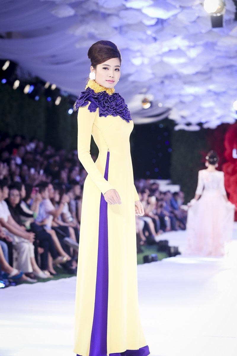 | Ninh Hoàng Ngân trình diễn mẫu áo dài cưới có điểm nhấn kết hoa tại cổ áo. Tông màu vàng và xanh kết hợp ăn ý.