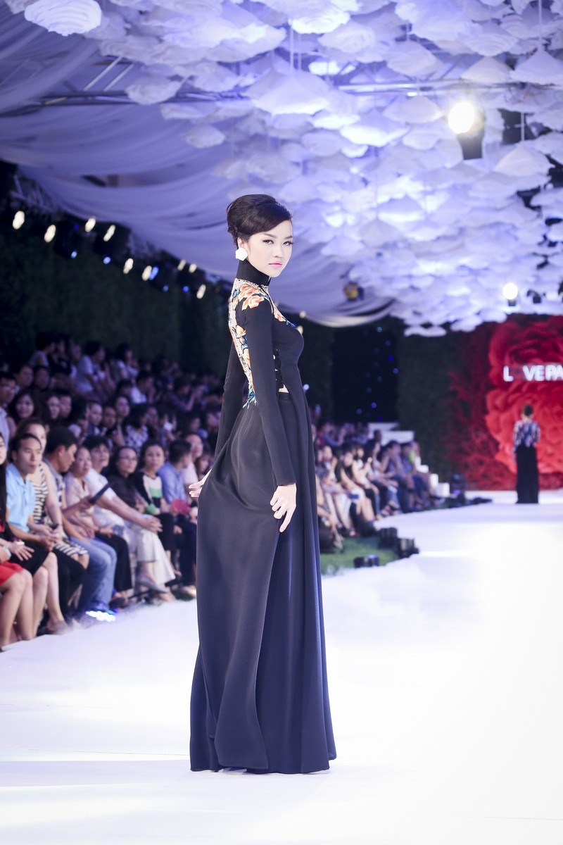 | Thùy Linh diễn mẫu thiết kế có điểm nhấn hoa 3D sau lưng áo.