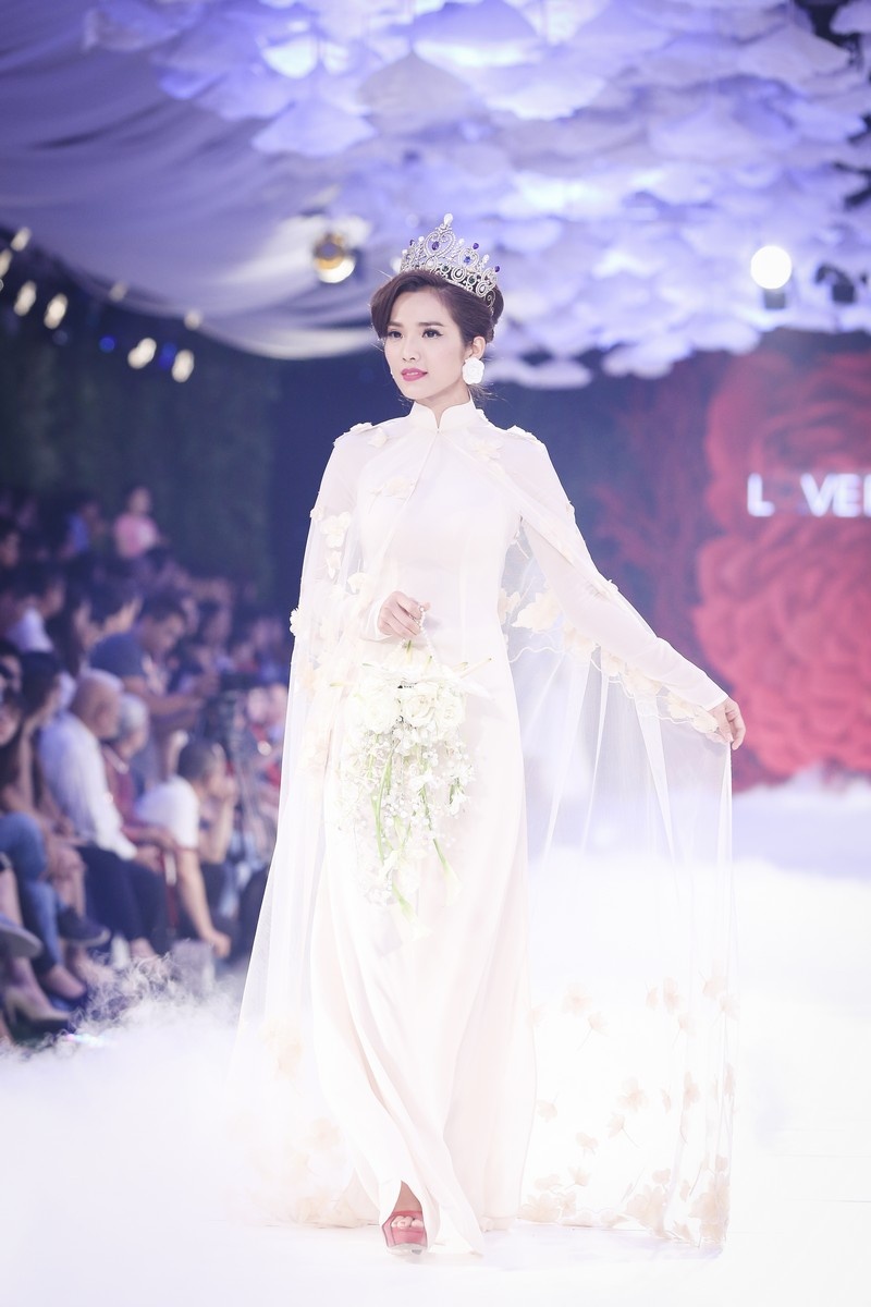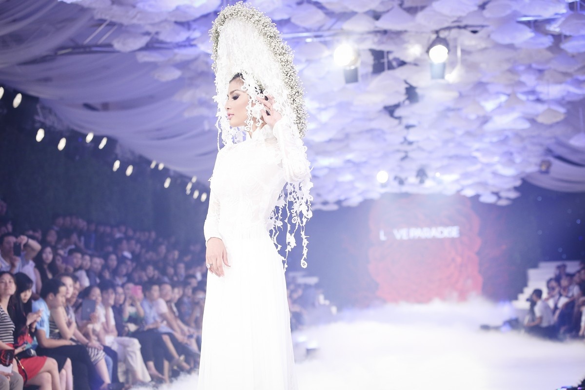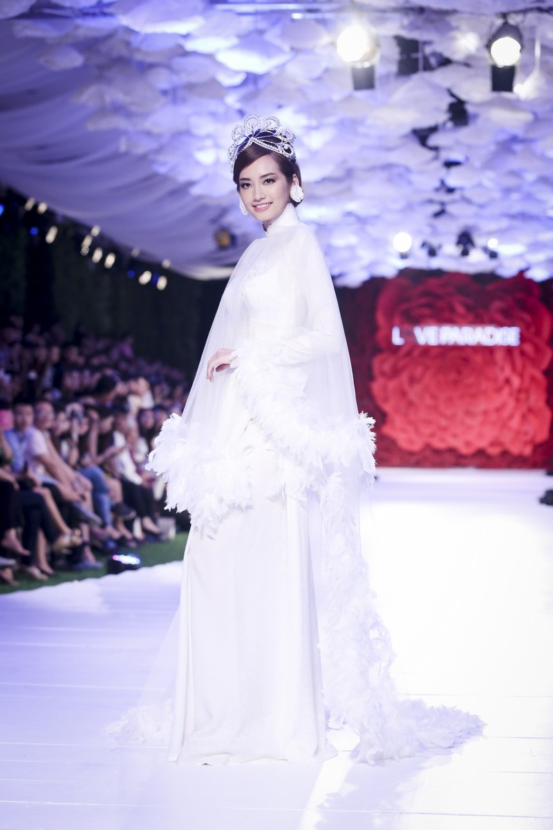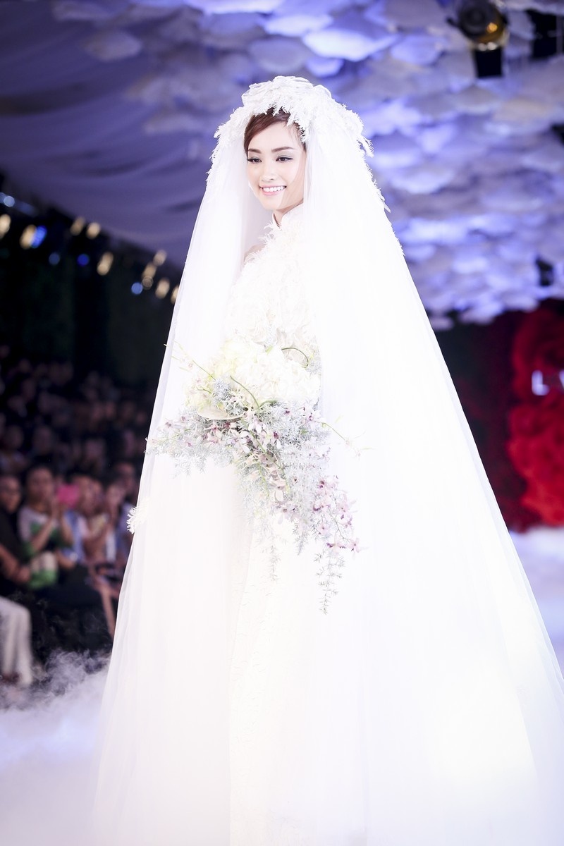 | Trương Thị May gây bất ngờ khi xuất hiện với mẫu áo dài ren trắng tinh. Đầu đội mấn cô dâu kiểu cách, được kết hạt cầu kỳ và tạo kiểu che kín mặt người mẫu. Khi trình diễn, người đẹp còn cầm trên tay chiếc bình hoa hồng màu trắng làm điểm nhấn nhá.