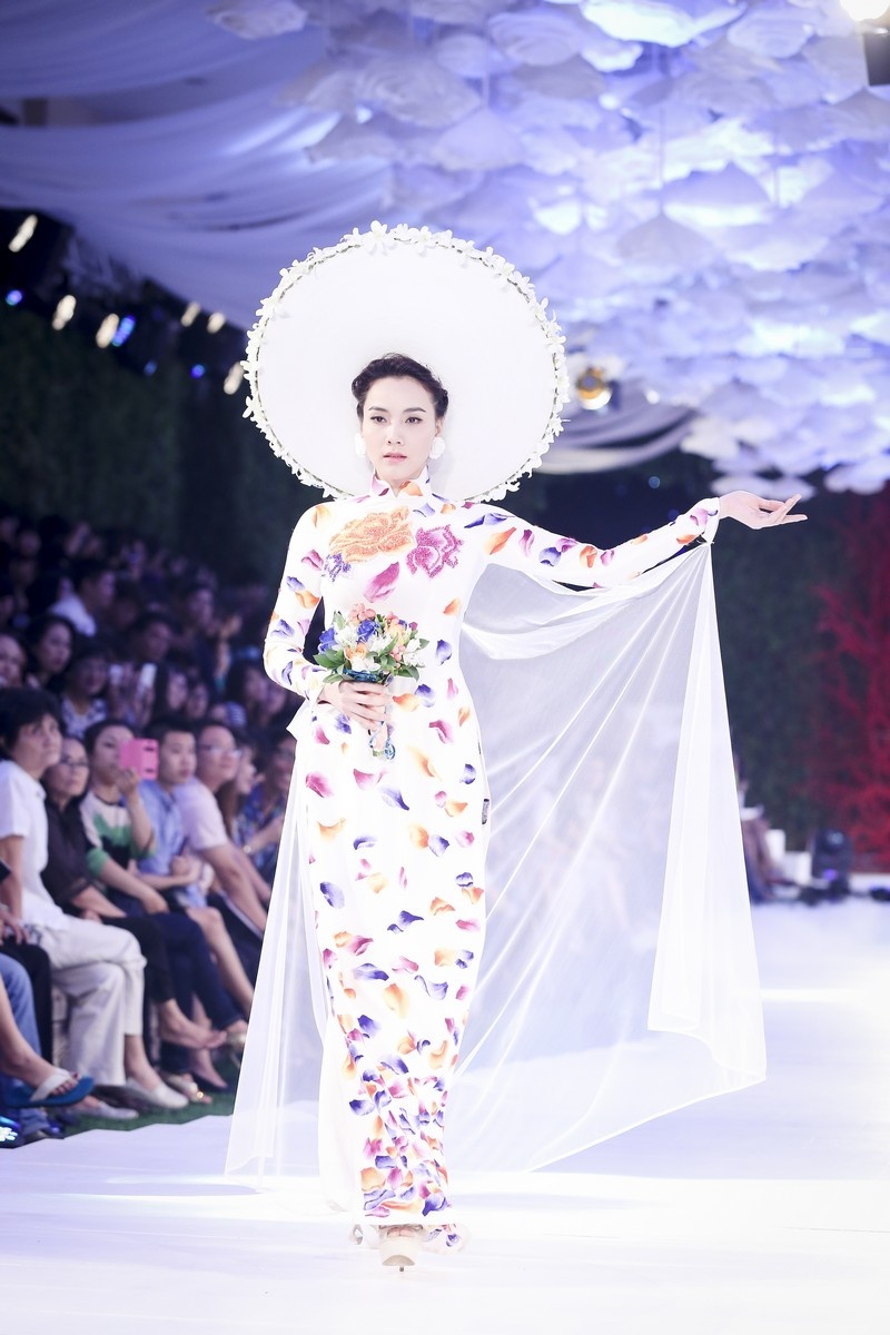 | Trong khi đó, Trang Nhung nổi bật với mẫu áo dài in họa tiết cánh hoa nhiều màu sắc. Đầu đội mấn lớn đính hoa khá bắt mắt. |