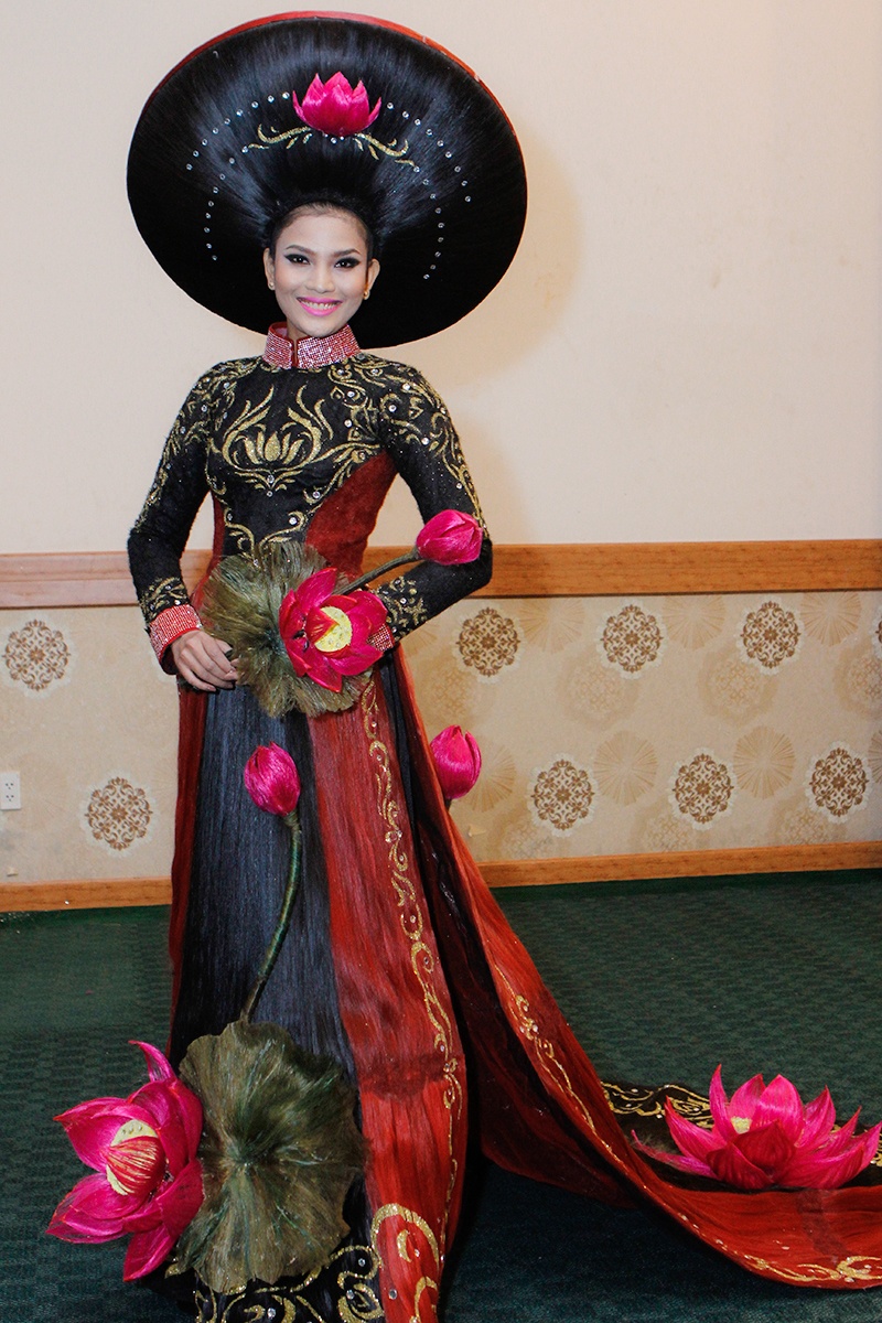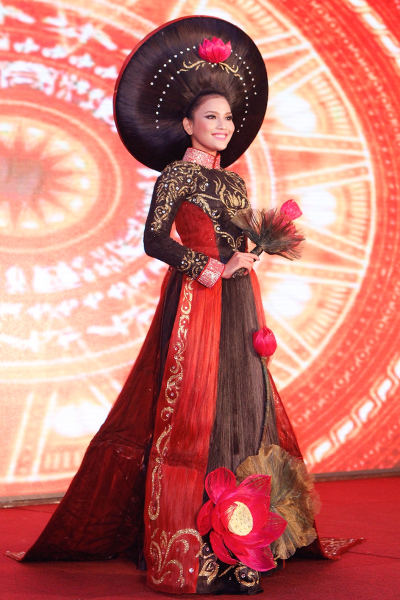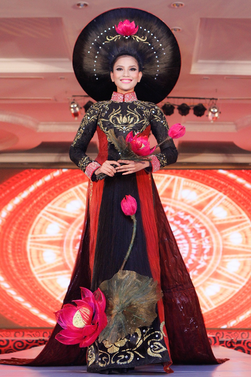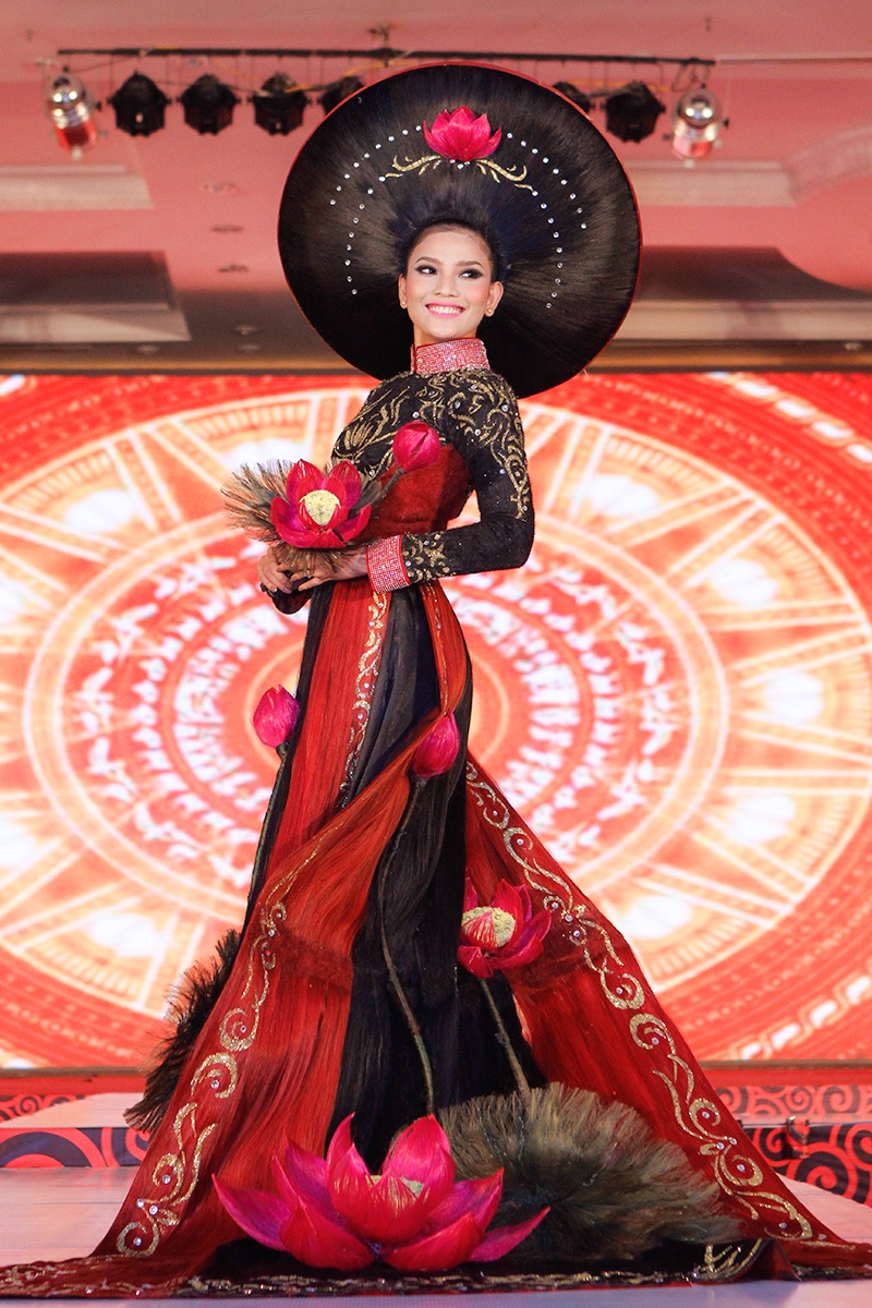 | Chính chiếc áo dài của nhà thiết kế Thuận Việt, từng được trang web Missosology nổi tiếng xếp hạng thứ 4 trong danh sách các bộ quốc phục đẹp nhất của cuộc thi này đã khiến Sáng Tân Vĩnh nảy sinh ra ý tưởng thực hiện một bộ áo dài bằng tóc cùng cảm hứng chủ đạo từ hoa sen – một loài hoa gắn bó với hồn Việt. |