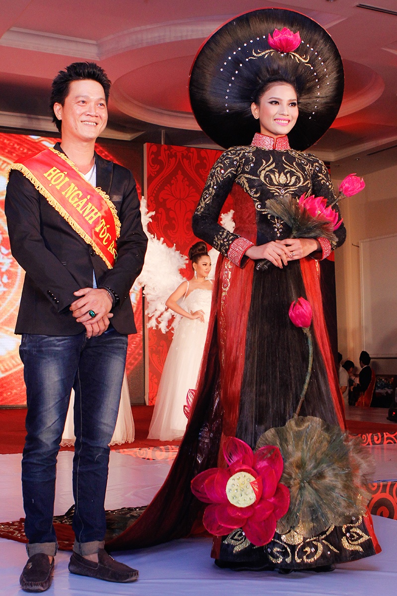 | Tối 13/2, lễ tri ân Tổ nghiệp ngành tóc Việt Nam 2014 đã diễn ra tại TPHCM với sự tham gia của nhiều nhà tạo mẫu tóc nổi tiếng trong nước. Á hậu Trương Thị May chính là tâm điểm chú ý khi nhận nhiệm vụ khoác lên mình bộ áo dài bằng tóc độc đáo do nhà tạo mẫu tóc Sáng Tân Vĩnh thiết kế. |