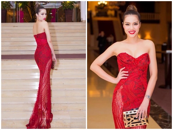 Nữ diễn viên Quách An An giữ vững phong độ thời trang gợi cảm khi tham dự các sự kiện showbiz Việt. Tuần vừa rồi, góp mặt trong đêm nhạc của Giáng My, người đẹp nổi bật trong thiết kế gam màu đỏ xuyên thấu của Hoàng Hải. Bộ cánh ôm dáng, khoe vai trần gợi cảm làm tăng sức hút hấp dẫn của vóc dáng kiêu sa và làn da trắng hồng. Tông trang điểm đậm hợp tổng thể và phụ kiện clutch chất metallic sang trọng, quý phái.
