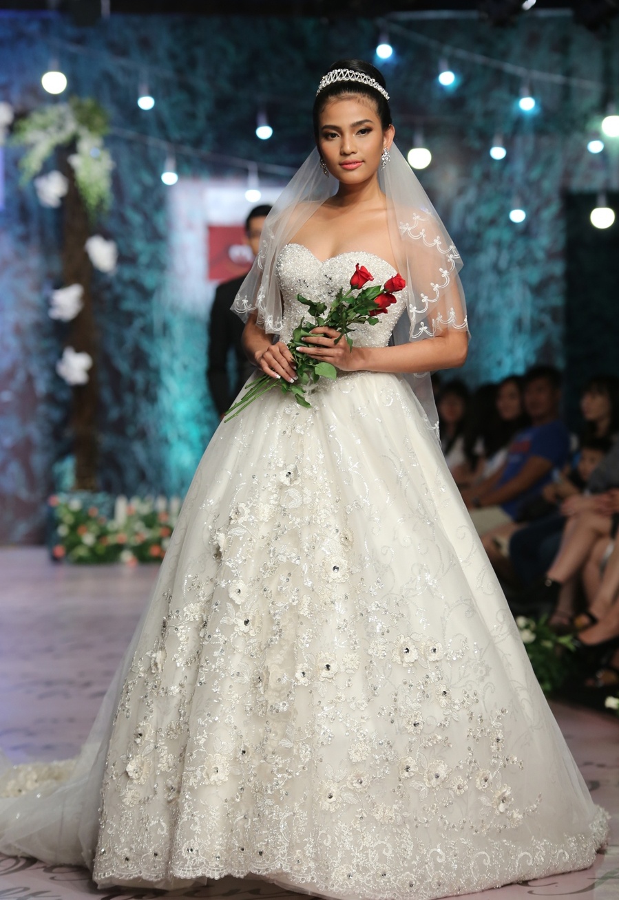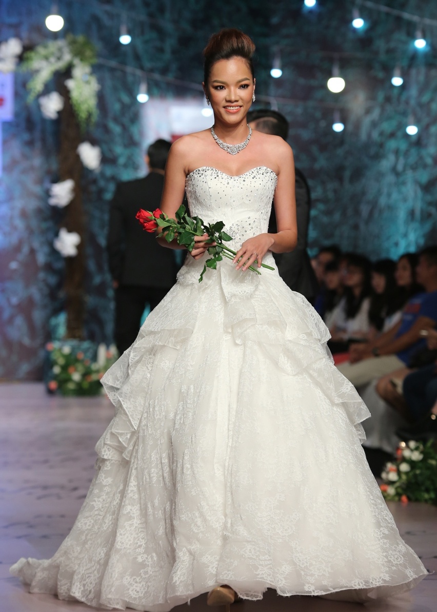 | Tối 27/10, Trương Thị May tham gia trình diễn ở chương trình Phong cách trẻ số tháng 10, tại TP HCM. Trên sàn diễn định kỳ, á hậu dân tộc thể hiện bộ sưu tập váy cưới mùa thu lãng mạn. Trong ảnh, người đẹp tự tin toả sáng với bộ đầm xoè ren trắng, cúp ngực sexy. |