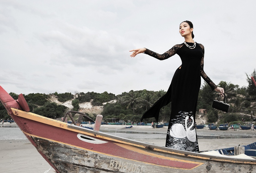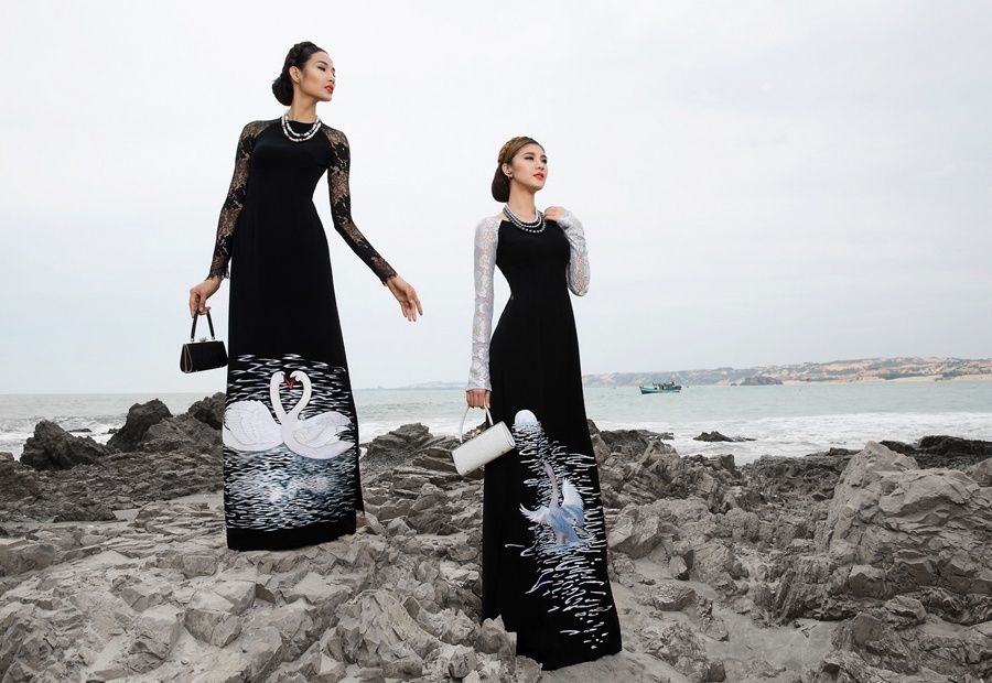 | Hoàng Thùy cũng tham gia chuyến đi này, cô tạo dáng uyển chuyển với thiết kế tông đen pha ren ở tay áo, họa tiết đôi thiên nga trắng in tinh xảo trên nền vải tối màu. |