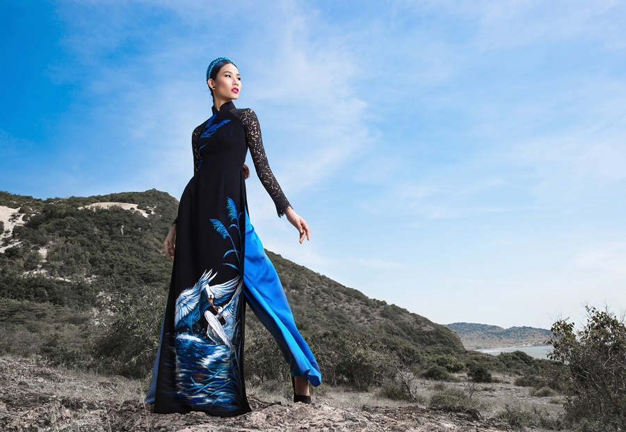 | Bộ cánh tiếp theo được phối tông màu xanh - đen hài hòa. Thiết kế làm bật lên họa tiết đôi cò và sông nước đậm hồn Việt. |