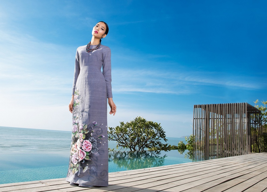 | Sau đó, quán quân Vietnam's Next Top Model thể hiện áo dài cách tân với họa tiết hoa hồng in trên tà áo. |