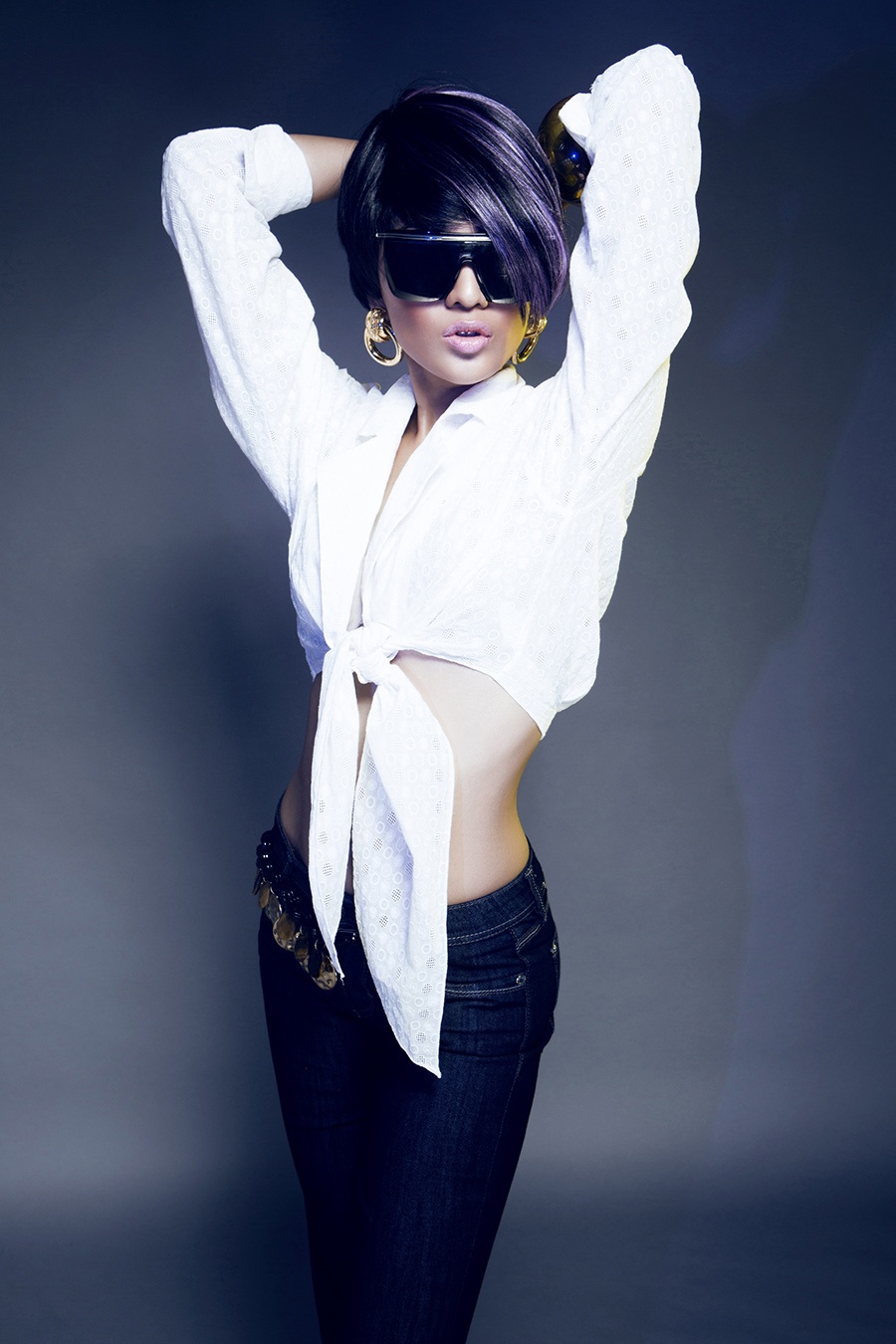 | Ở bộ ảnh lần này, cô tiếp tục duy trì phong cách cổ điển, sang trọng của những thập niên 60 - 70, vừa gợi cảm vừa mạnh mẽ. Để phù hợp với hình tượng mới, Trương Thị May đã nhuộm tóc line màu trắng - tím ấn tượng. Sở hữu ngoại hình hoàn hảo, cô dễ dàng diện áo sơ-mi thắt vạt cao, để lộ khoảng eo thon 60cm. |