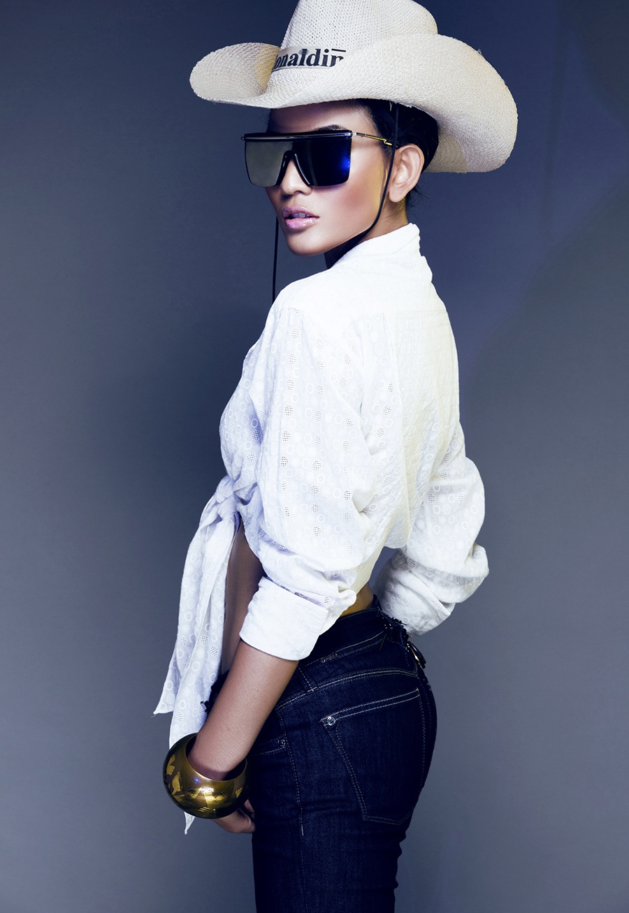 | Trang phục cô khoác lên mình có sự thống nhất về phong cách, người đẹp diện quần jeans ống loe cổ điển đậm phong cách những năm 70. Phụ kiện mũ phớt, kính râm và hoa tai to bản ăn nhập với hình ảnh những cô gái cao bồi mạnh mẽ miền Viễn Tây. |