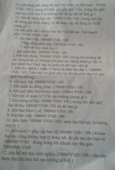 Ngoài các khoản thu quá cao, phụ huynh lớp này cũng cho rằng tiền hội phụ huynh học sinh khối lớp 3 nên giữ ở mức 100.000 đồng như mọi năm thay vì 150.000 đồng như năm nay; Tiền quỹ giáo dục nên giữ ở mức 150.000 đồng như năm trước thay vì 200.000 đồng trong năm mới. Tiền trông giữ xe nên ở mức 30.000 đồng thay vì 50.000 đồng.