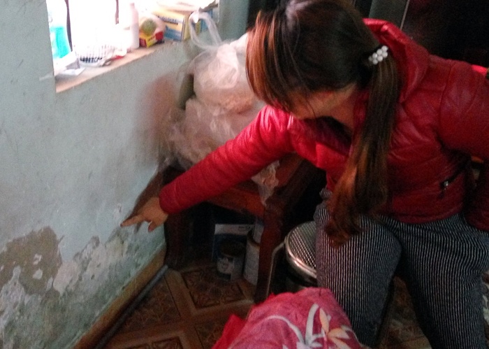 | Chị Hà chỉ nơi bố chồng bị đâm, vẫn còn vết máu khô bám tường. Ảnh: Hoàng Lam. |
