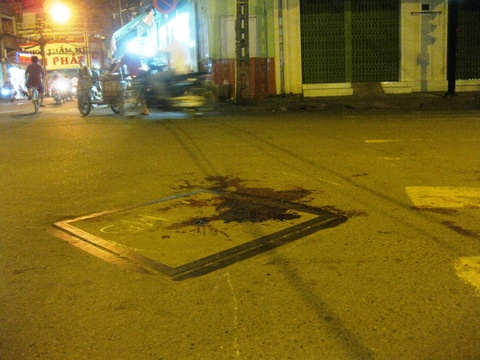 | Vết máu tại ngã tư Hàn Hải Nguyên - Phú Thọ, nơi anh Bình bị đâm chết. |