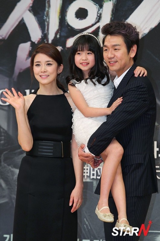 | Kim Yoo Bin và "bố mẹ trong phim" Lee Bo Young - Jo Seung Woo trong buổi họp báo God's Gift - 14 Days. |