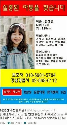 | "Thông báo" mất tích của đài SBS đăng trên mạng xã hội với hình ảnh của cô bé Han Seat Byul mất tích trong phim. |
