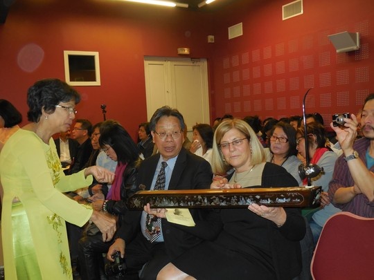 | GS Trần Quang Hải giới thiệu với khán giả Pháp về đàn bầu của Việt Nam. |