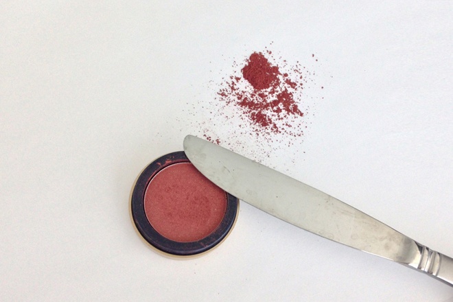 | Dùng dao cạo một ít bột khoáng màu và đổ bột này vào hỗn hợp đã đun nóng. Cần đổ từng chút một, khuấy đều cho màu khoáng tan chảy hoàn toàn. Bạn cần lưu ý là khi nguội và đặc lại son sẽ trông sậm màu hơn lúc còn nóng để ước lượng được màu son như mong muốn. |