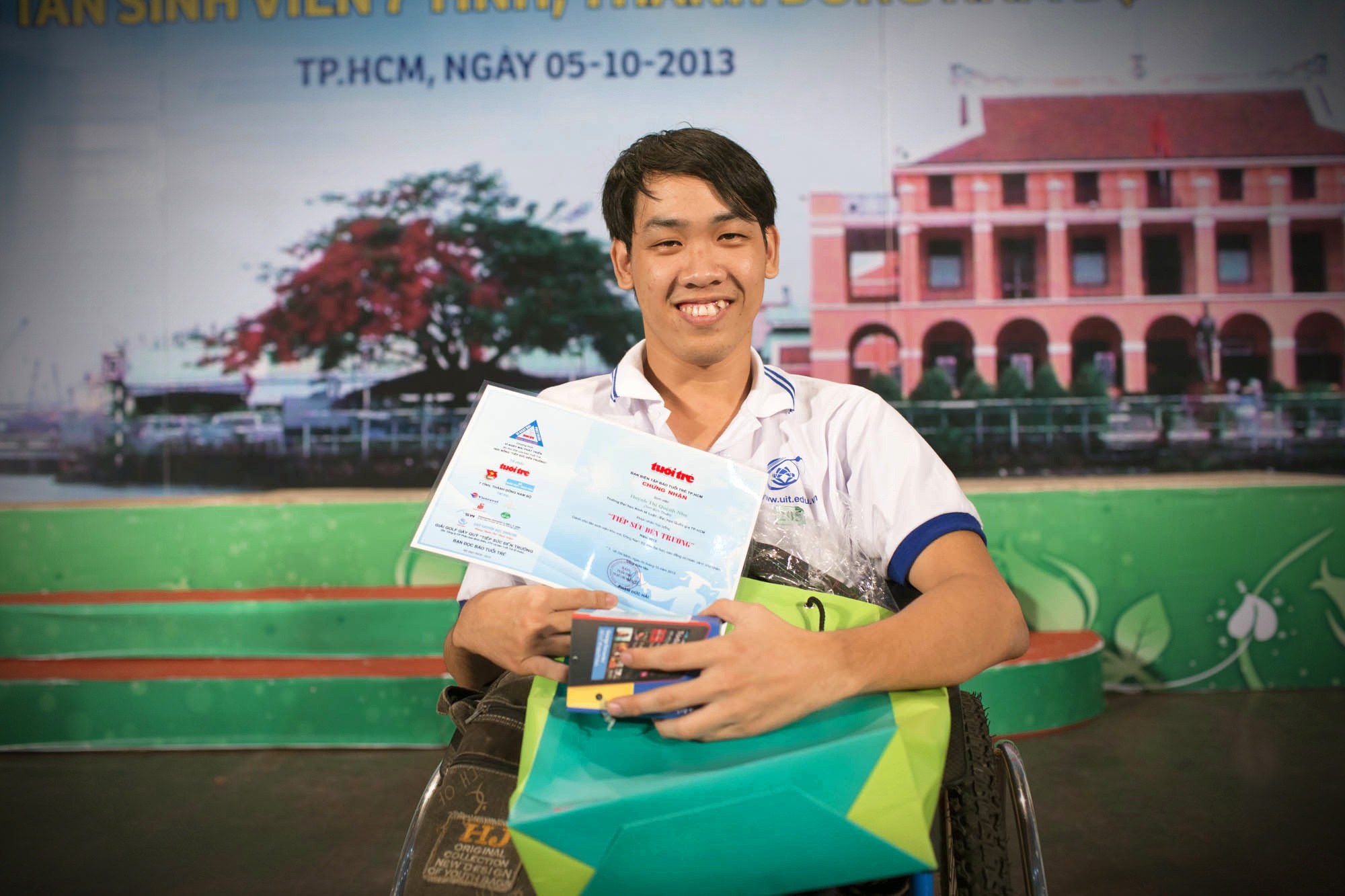 Trong buổi tối ngày 5/10 tại nhà văn hóa Thanh Niên (TP.HCM), tại lễ trao học bổng Tiếp sức đến trường - một quỹ học bổng do báo Tuổi Trẻ đồng tổ chức cùng Nokia & FPT Việt Nam, hình ảnh một thanh niên trên chiếc xe lăn được công kênh lên sân khấu đã khiến nhiều người xúc động rơi nước mắt.