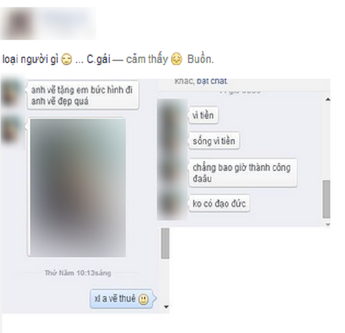 | Đoạn chat giữa cô gái và chàng vẽ tranh sau khi tung lên mạng trở thành đề tài bàn tán của giới trẻ. Những bạn hoạt động trong lĩnh vực hội họa đặc biệt bất bình về suy nghĩ của cô gái. |