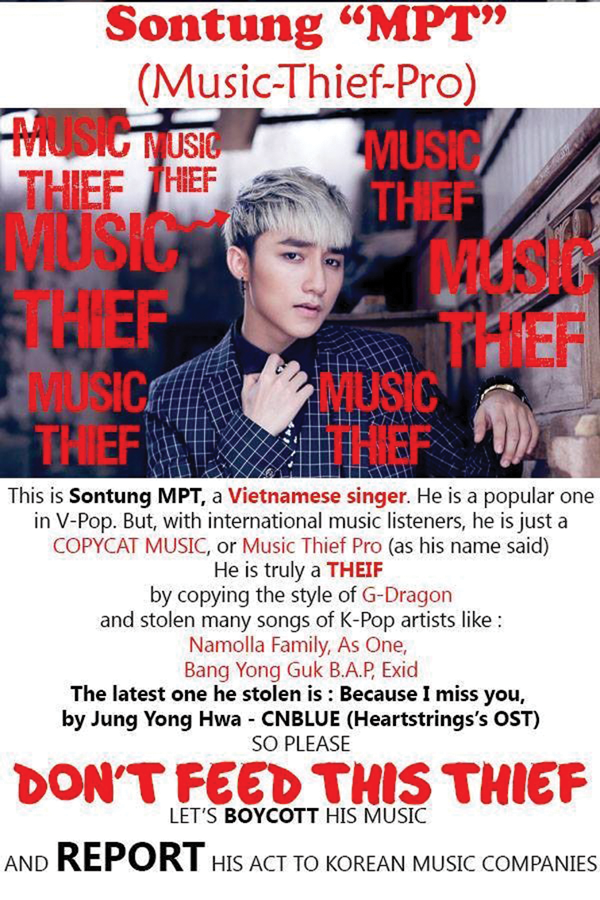 Sự ồn ào gần như vượt mức kiểm soát khi mới đây, nhiều khán giả trẻ đã tố Sơn Tùng trên trang của ca sĩ Hàn Quốc bằng những lời lẽ nặng nề: kẻ cắp chuyên nghiệp. Nhiều người lên án giới trẻ ngày nay thiếu hiểu biết khi cư xử, vội vàng “vạch áo cho người xem lưng” khi chưa hề xác định được sự việc đúng hay sai. Nhưng, xét ở góc độ nào đó, giới trẻ - không chỉ khán giả mà còn là người sáng tác, là Sơn Tùng, FB Boiz… - chỉ có thể cư xử đúng khi được hiểu đúng, mà hiểu đúng ở đây cần phải có sự trợ giúp bởi sự thống nhất trong kết luận của những người có chuyên môn.