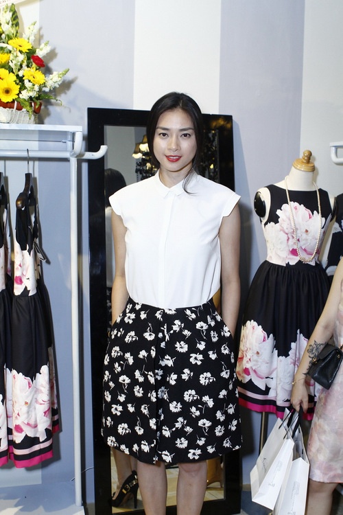 Sơ mi trắng đơn giản được Ngô Thanh Vân kết hợp rất đẹp mắt với váy họa tiết hoa đen trắng cá tính. |