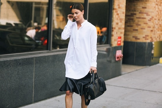 | Sơ mi trắng mix kèm váy da thanh lịch và sành điệu. |
