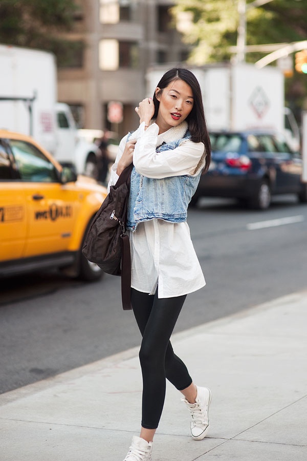 | Phong cách xuống phố cùng sơ mi, giày converse và áo gillet cá tính. |