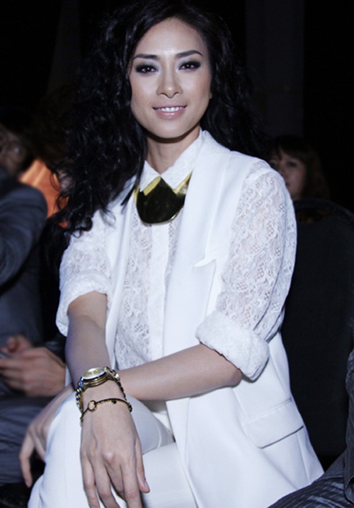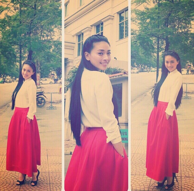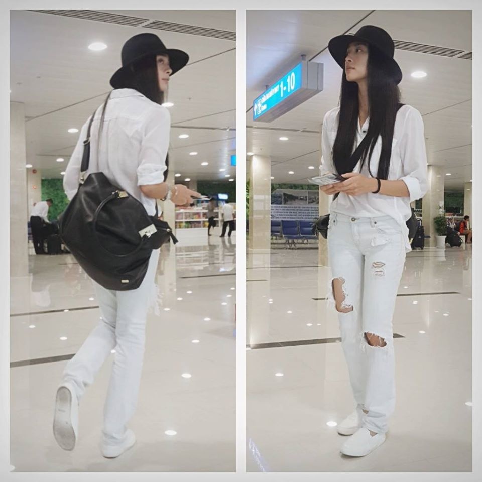 | Cách kết hợp cây trắng với một chiếc sơ mi đơn giản rất được Vân Ngô ưa thích. |