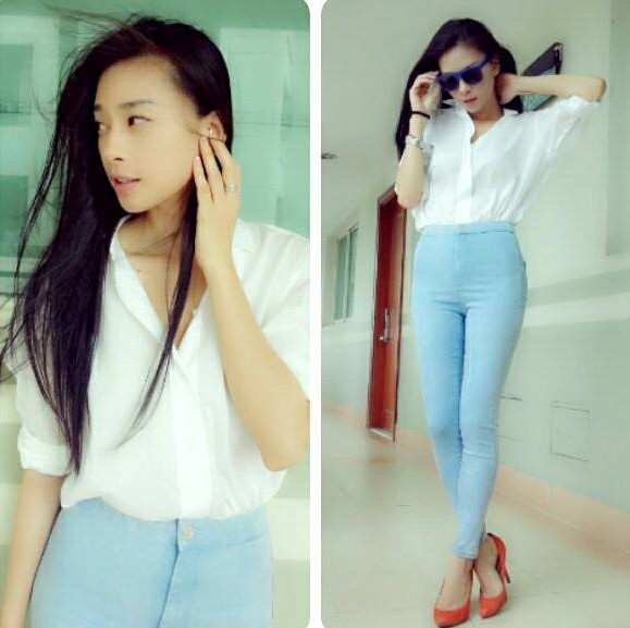 | Sơ mi trắng mix kèm quần skinny cạp cao giúp khoe đôi chân thon thả. |