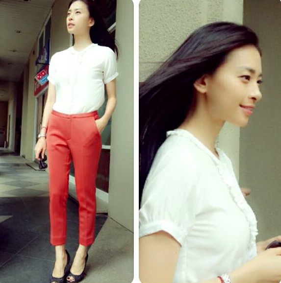 | Cách kết hợp rất đơn giản và ngọt ngào với sơ mi trắng và quần âu tông cam đỏ. |
