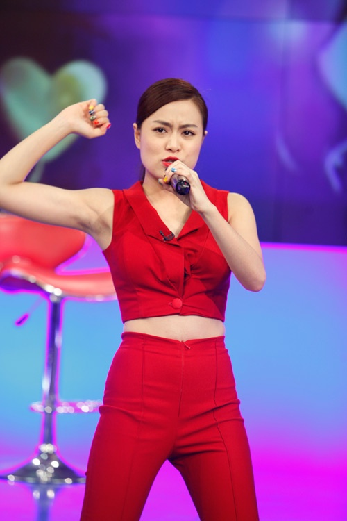 | Jumpsuit đỏ cũng thường được Hoàng Thùy Linh sử dụng để phù hợp với các vũ đạo. |