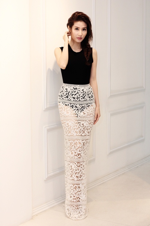 Chất liệu ren lưới kết hợp màu trắng giúp cô tôn vẻ thanh thoát.