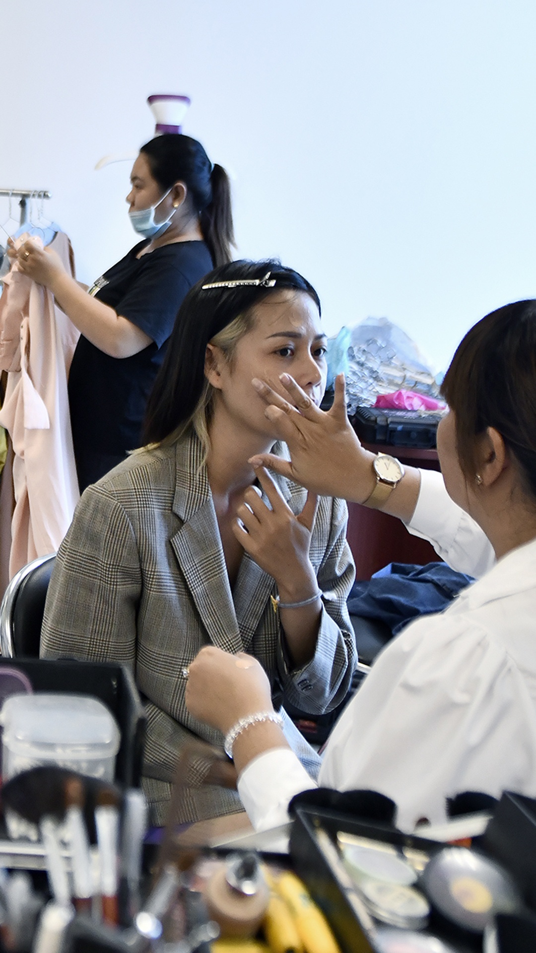 | Chờ khoảng 15 phút, tôi được gọi vào trang điểm. Đây thường là công đoạn đầu tiên cho buổi định trang của một diễn viên. |