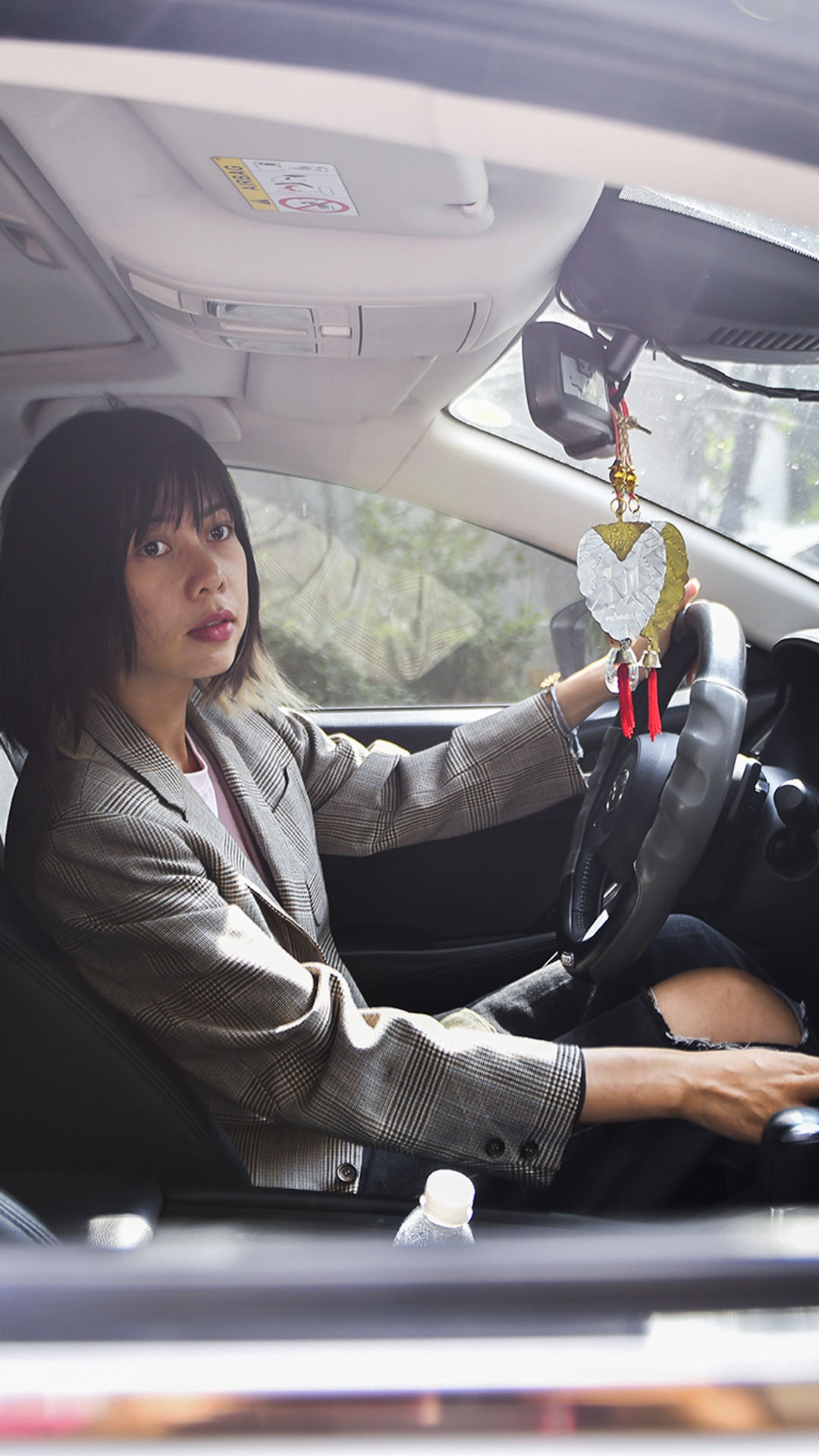 | Hôm nay được ê kíp yêu cầu mang nhiều đồ đạc, tôi tự lái ôtô tới phim trường thay vì di chuyển bằng xe máy. Tôi gặp khó khăn khi dòng xe cộ trên đường đông đúc. |