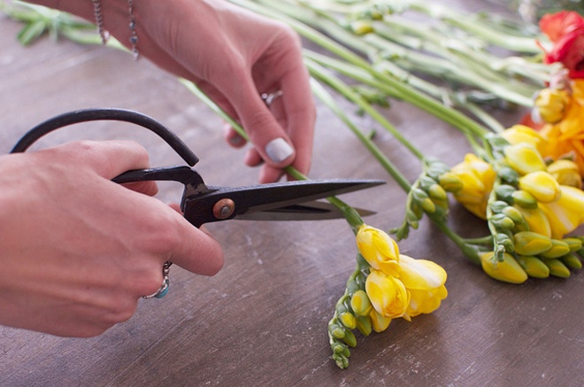 | Đầu tiên, dùng kéo cắt các cành hoa thành những đoạn dài khoảng 4 - 6 cm. |