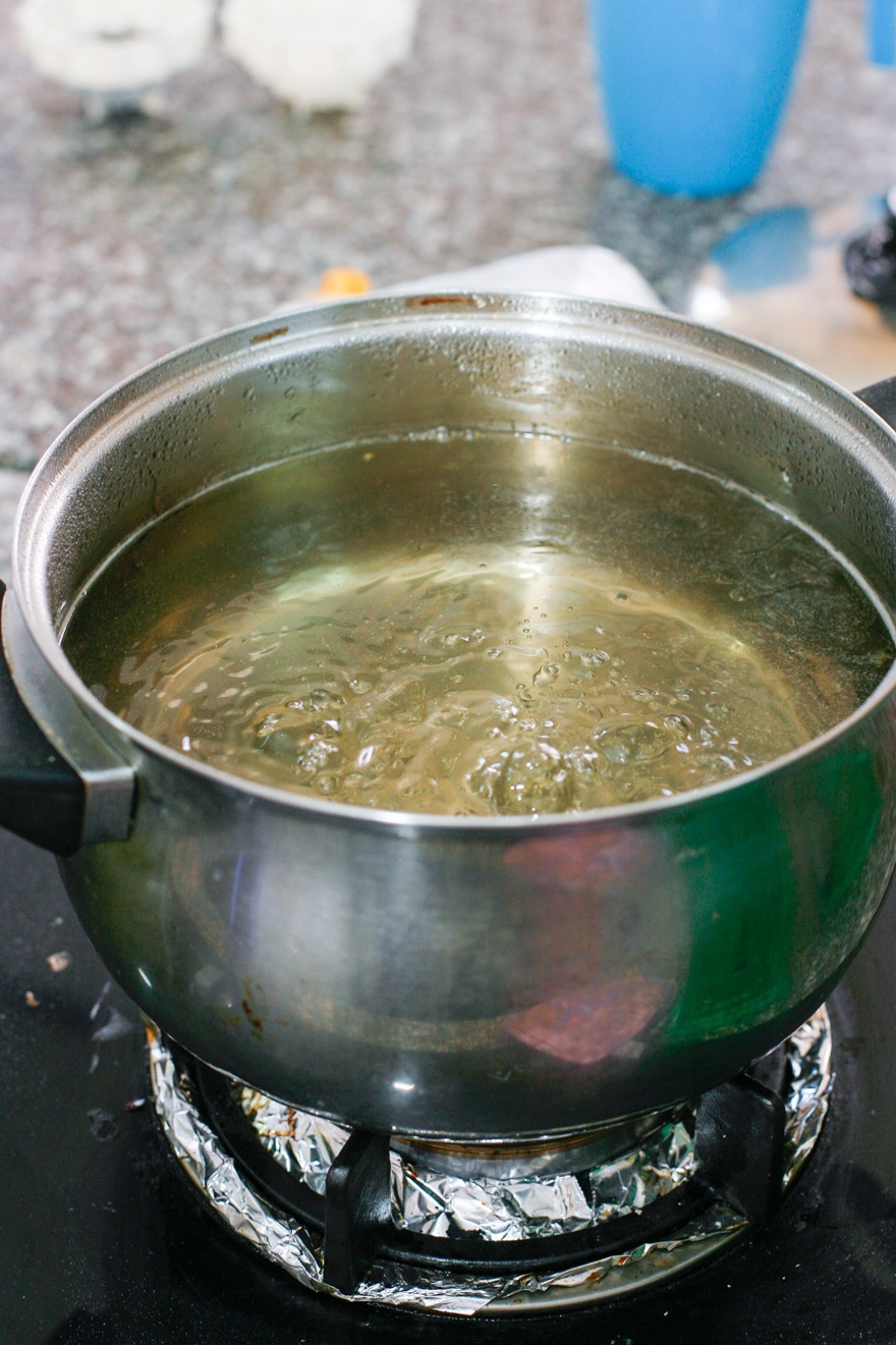 | Cho 1,5 lít nước + rau câu + 500gr đường vào nồi, khuấy đều. Cho nồi lên bếp đun sôi. Khi hỗn hợp sôi, vặn nhỏ lửa để nước trong nồi sôi nhẹ, rau câu không bị đông. |