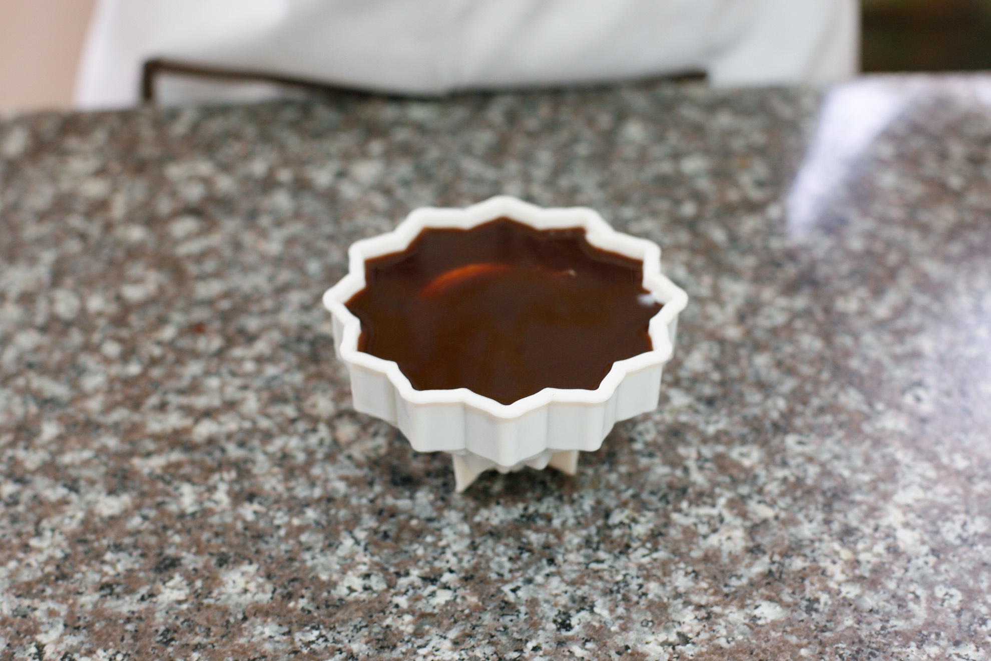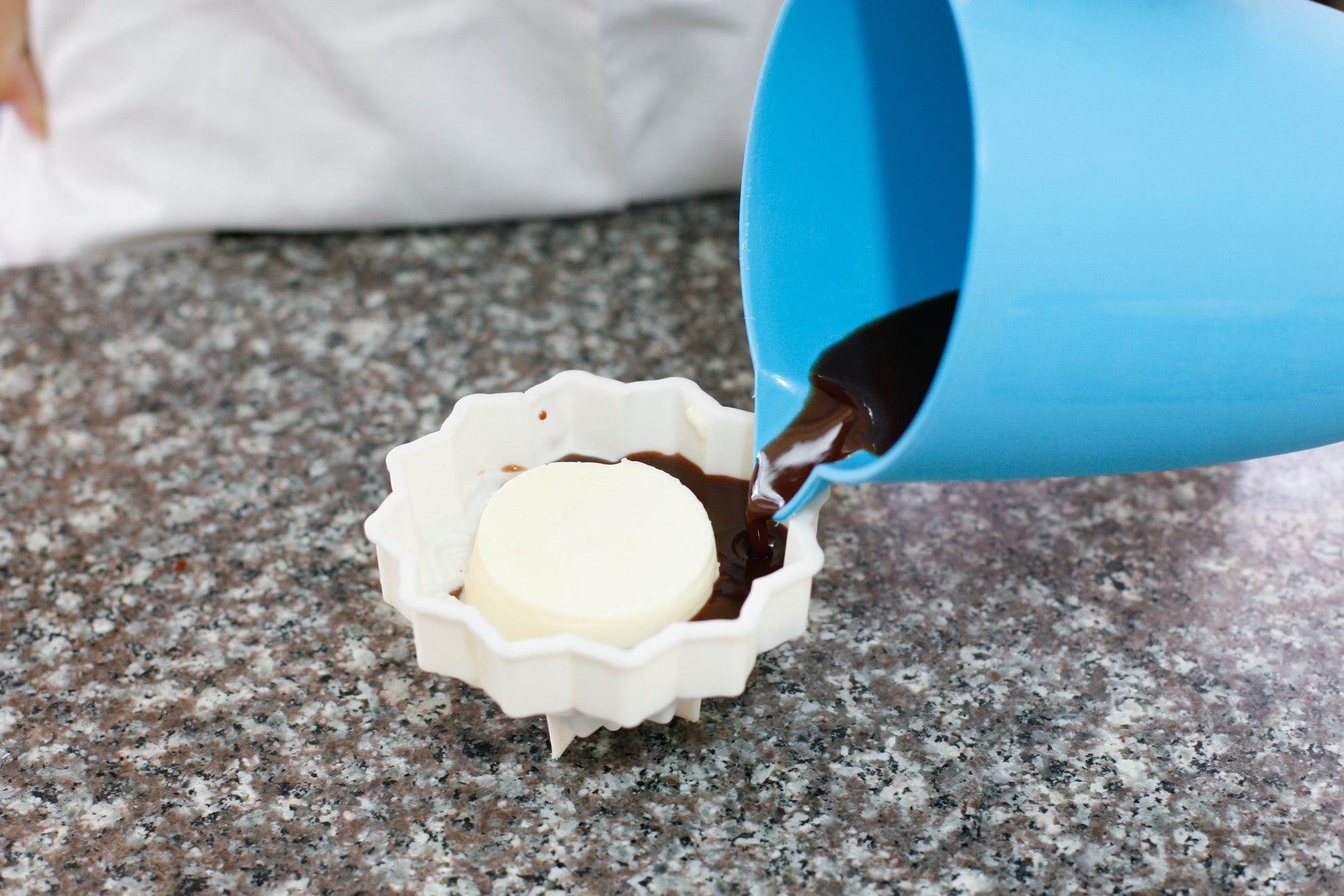 | Cho tiếp phần rau câu socola vào, sao cho rau câu bao phủ hết phần bánh flan. |