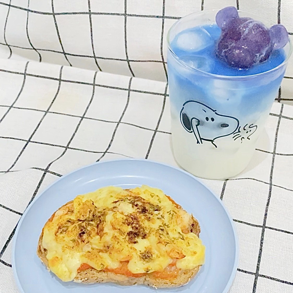 Bánh mì tôm phô mai sốt cà & Sữa tươi hoa đậu biếc