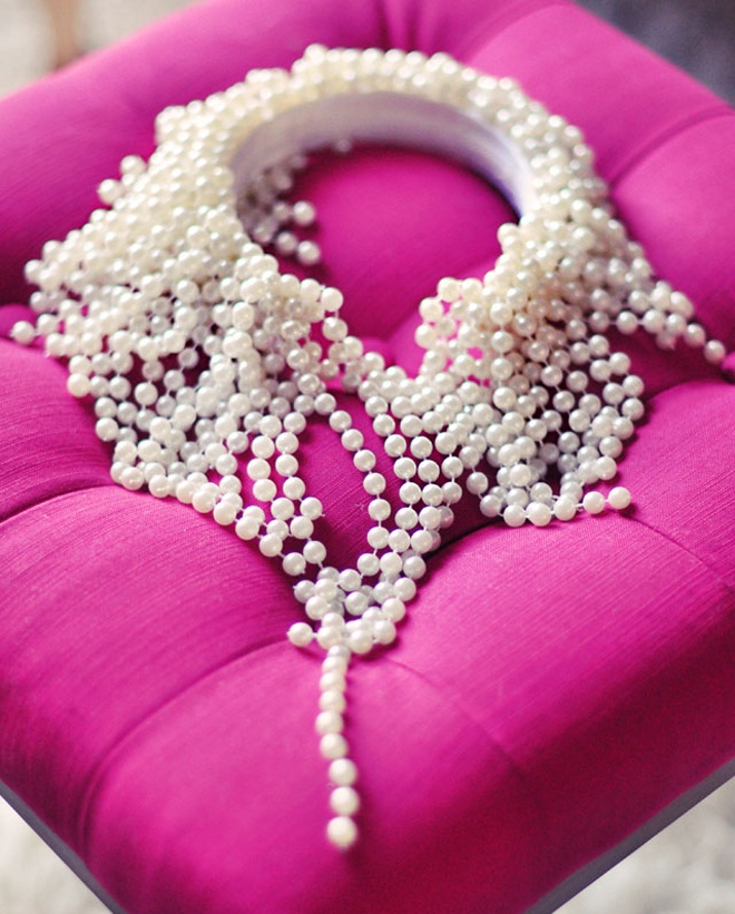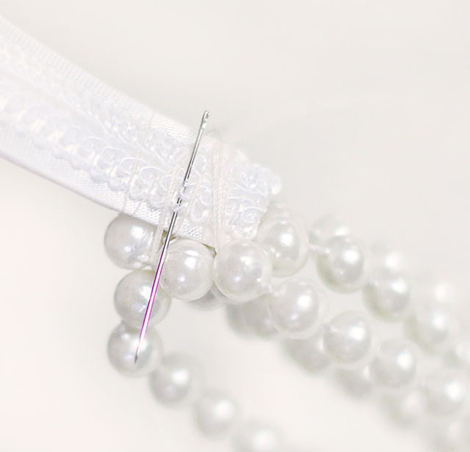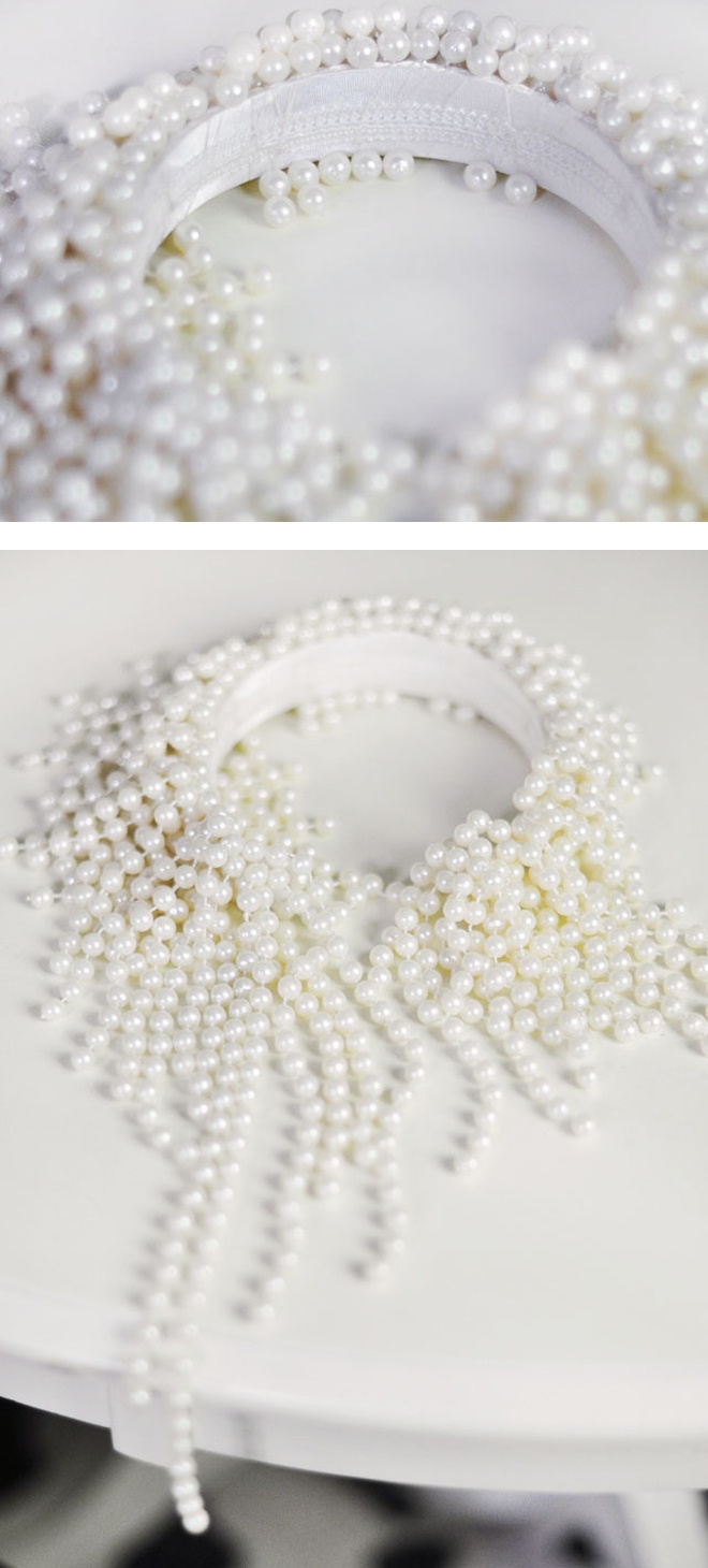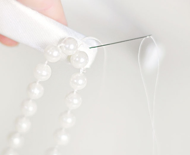 | Xếp lớp các đoạn dây cườm ngọc trai khác lên trên sợi dây bạn vừa khâu sao cho thành từng chùm dây chuỗi ngọc trai và tiếp tục khâu chúng vào chiếc băng đô. Lưu ý rằng đây là lúc bạn nên chọn những sợi dây dài nhất để tạo thành chuỗi dây dài quyến rũ buông hờ xuống đến giữa phần ngực, hay phần eo, tùy sở thích của bạn. |