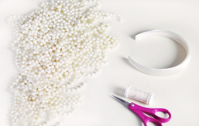 | Đầu tiên,chúng ta cần các nguyên vật liệu sau: một lượng lớn các dây hạt cườm giả ngọc trai màu trắng (hoặc màu sắc khác tùy theo sở thích của bạn), một chiếc băng đô cài tóc cùng màu với màu ngọc trai, một cây keo, ít chỉ trắng (hoặc chỉ tiệp màu với ngọc trai), một ống keo dán, một cây kéo, ít vải satin màu trắng. |
