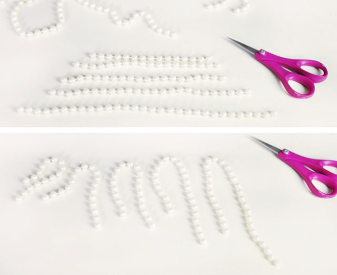 Để bắt đầu, hãy cắt chuỗi cườm ngọc trai thành nhiều đoạn từ ngắn đến dài nhằm dễ dàng tạo thành dòng thác ngọc trai. Sau đó, gấp từng đoạn dây đã cắt thành 2 phần dài ngắn không đều và lấy kim khâu vào chiếc băng đô cài tóc như hình minh họa. Bạn cũng nên để các đoạn dây này dài hơn một chút vì sau khi may xong, bạn mới bắt đầu cắt theo dạng thác nước đúng như ý thích của mình.